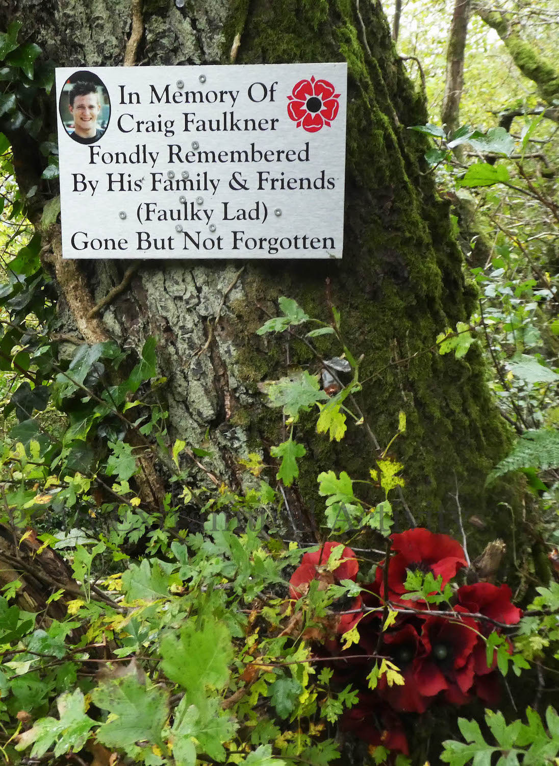 Craig Faulkner died by suicide on July 8th, 2016 (Belfast Live). His was one of the deaths among amateur footballers that spurred the SAMHI initiative (Belfast Live). (See previously: It’s OK To Talk). This board to his memory is on the path between Hightown Road carpark (above the Horseshoe Bend) and the top of the Cavehill Road – he was from and played soccer in Ballysillan.