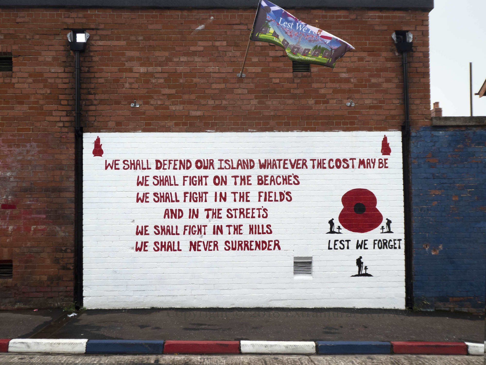 The mural in Castlereagh Parade has been repainted for the centenary of the end of WWI, but with some notable differences. Three flag-holders have been added above. On the right are now a poppy and mourning soldiers. The quote comes from a speech by Winston Churchill on 1940-06-04 – “We shall defend our island whatever the cost may be. We shall fight on the beaches. [We shall fight on the landing grounds.] We shall fight in the fields and in the streets. We shall fight in the hills. We shall never surrender.” – but the current first line was previously omitted in favour of another Churchill quote: “We have nothing to offer but blood, tears, and sweat.” See: Whatever The Cost May Be.