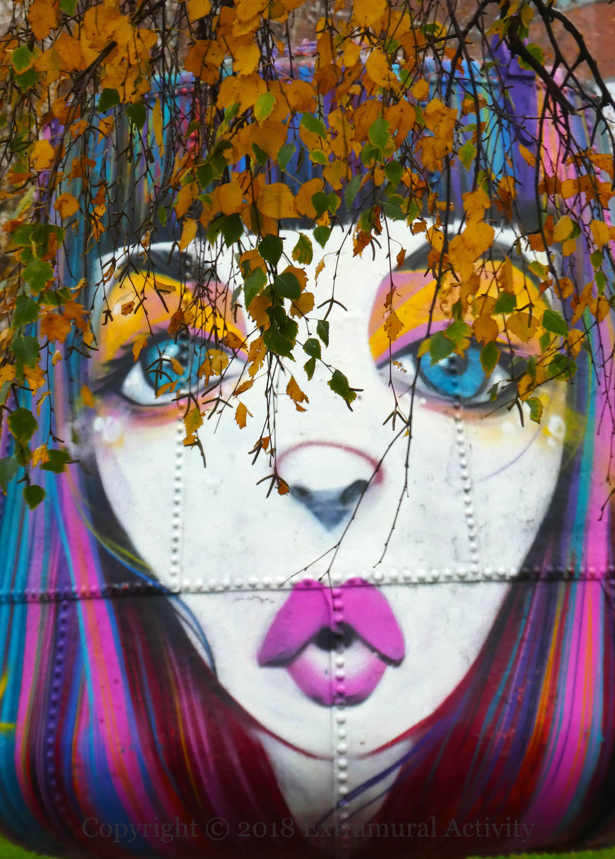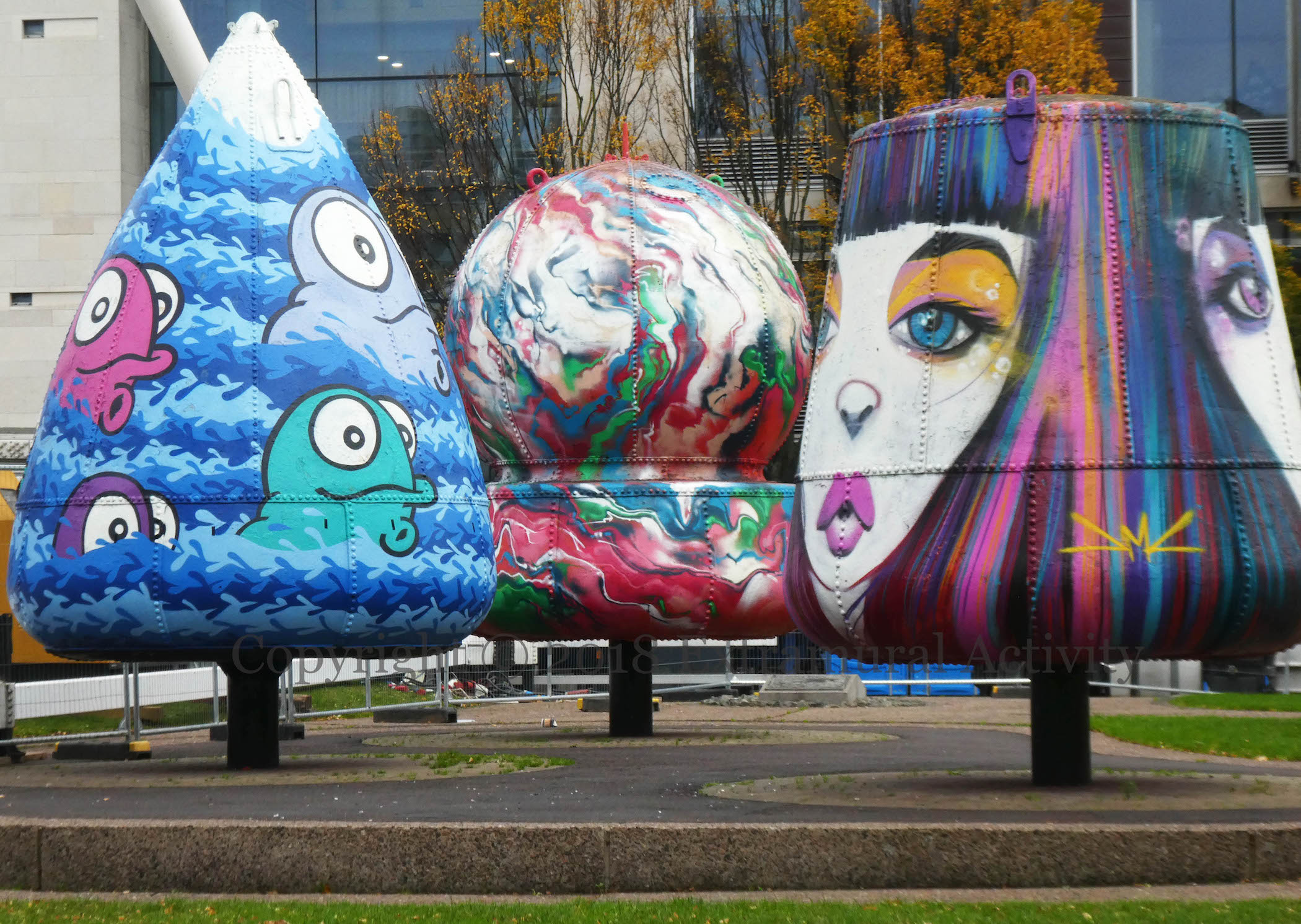 Since the 1980s (BBC | BelTel), Belfast’s maritime history has been celebrated in the form of three buoys outside the Belfast School of Art (known to all as “the art college) in York Street. They were given a face-lift during CNBX/HTN18 by DMC (ig) (above) and (in the middle, below) KVLR (tw) and (on the left) Nol (web | ig | Fb).