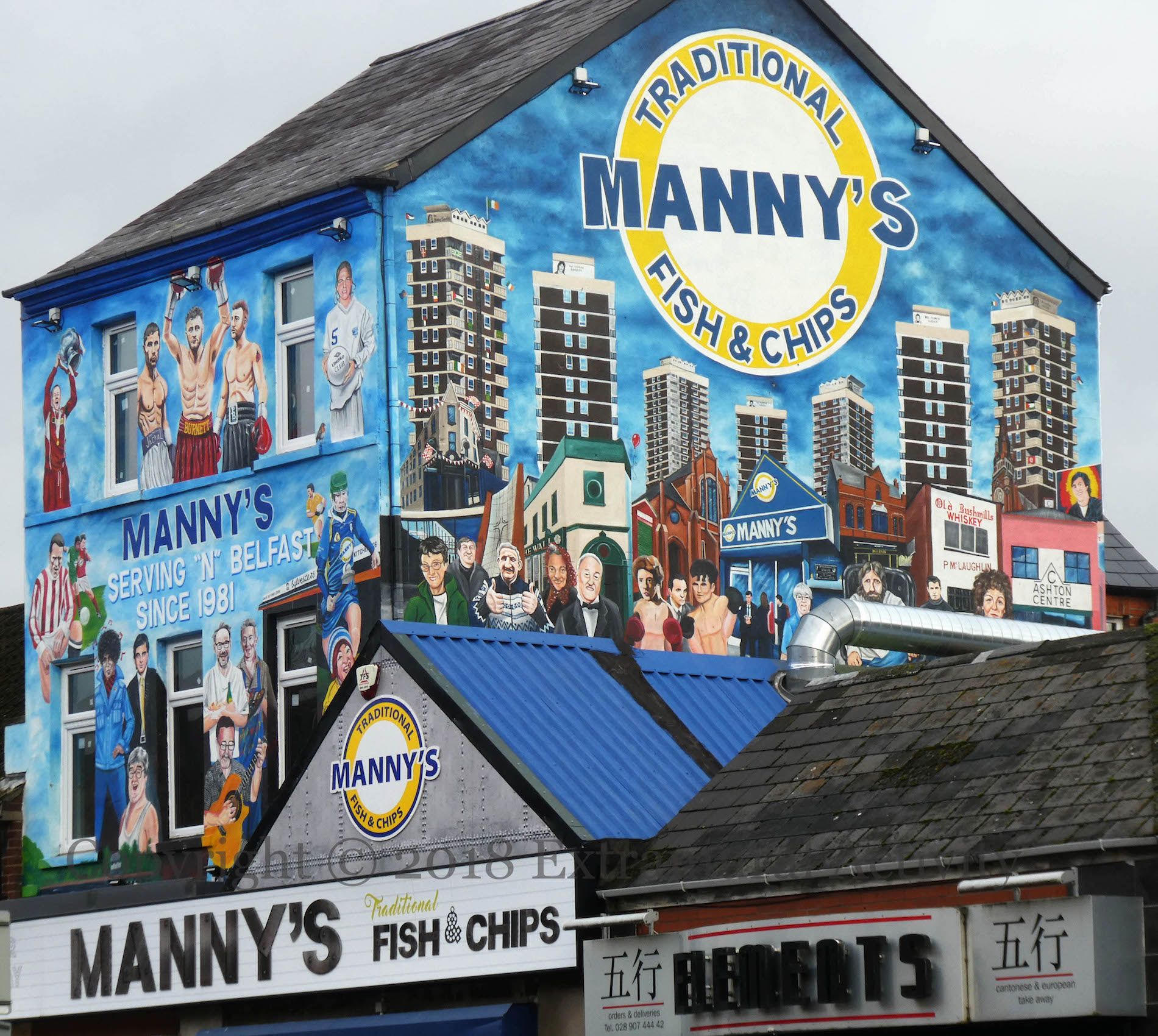 The “N”orth Belfast Manny’s now matches the city centre location, with a mural featuring local faces and places, even down to the inclusion of a vintage mural, in this case the old Joe Doherty mural from the New Lodge Road in the late 80s. Among those included are a trio of boxers – Carl Frampton, Ryan Burnett, and Paddy Barnes (the latter two went to school together at Bearnageeha) — and media personalities Eamonn Holmes and May McFettridge (John Linehan). Locations include the New Lodge towers and Manny’s itself, including the plaque to Dana and Kevin Fitzpatrick who were hit by death-drivers.