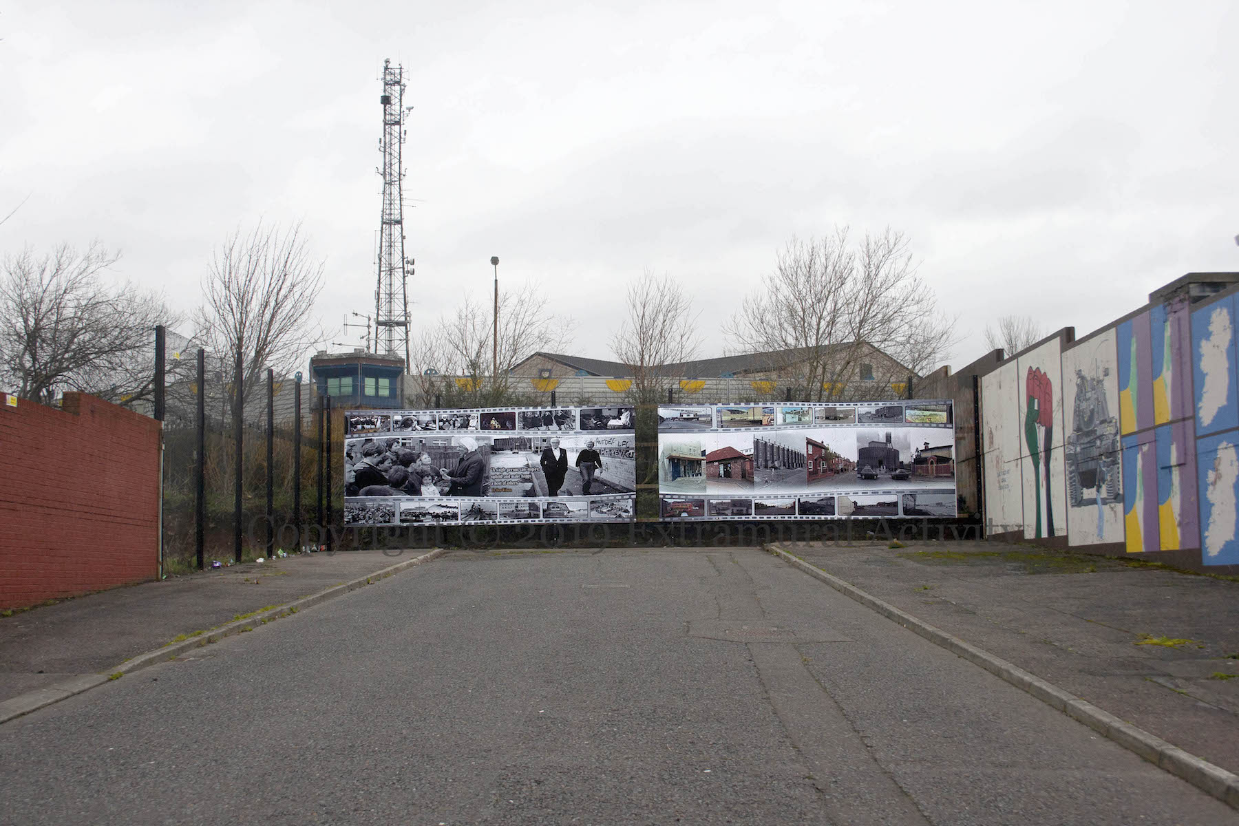 The wall at the top of Springhill Avenue was knocked down to great acclaim in 2017 (Guardian) but the impact was merely cosmetic as a wire fence and substantial shrubbery continued to block the way. The removal of the wall also meant the removal of the pro-Palestinian murals painted on it: Palestine Abú | Man Against Machine | Hellfire. In its place has now been put a large board celebrating the history of the area and especially the contribution made by Des Wilson and Noelle Ryan who worked in Springhill House for over forty years. Both Des and Noelle were interviewed by NVTv in 2012. Des turned 93 in July (encomium by Gerry Adams); Noelle died in 2014 (An Phoblacht | BBC-NI).