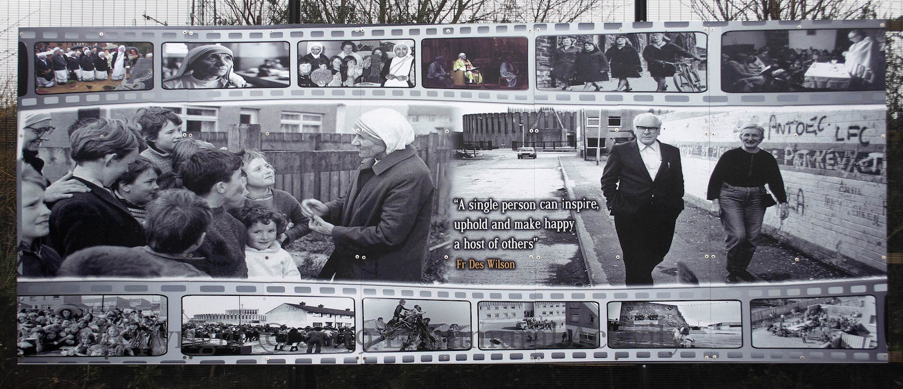 The left hand side of the mural shows Mother Teresa, who lived and worked in the area with four nuns from 1971 to 1973 before being put out (allegedly) by the Catholic church (TripleVision documentary).