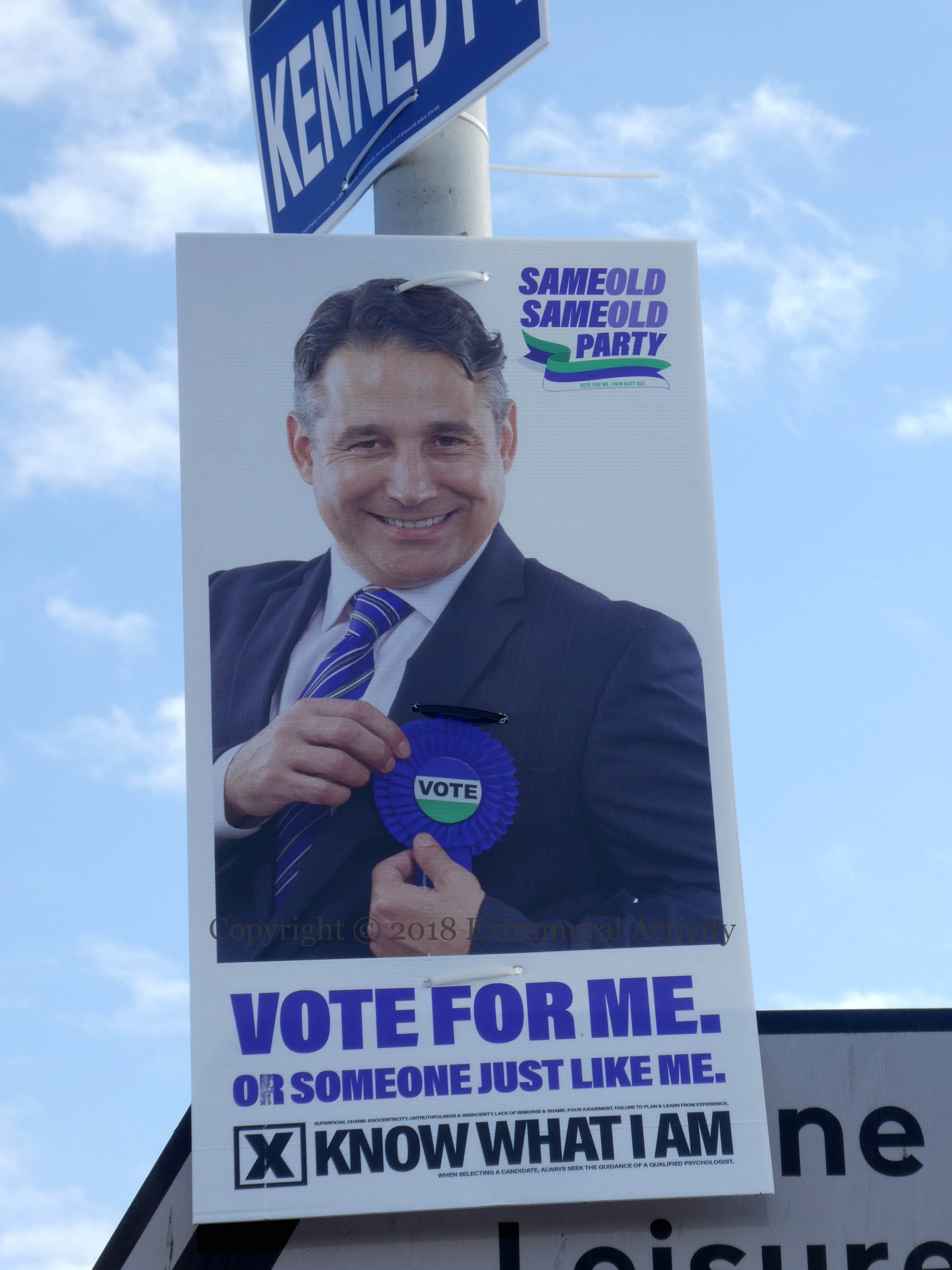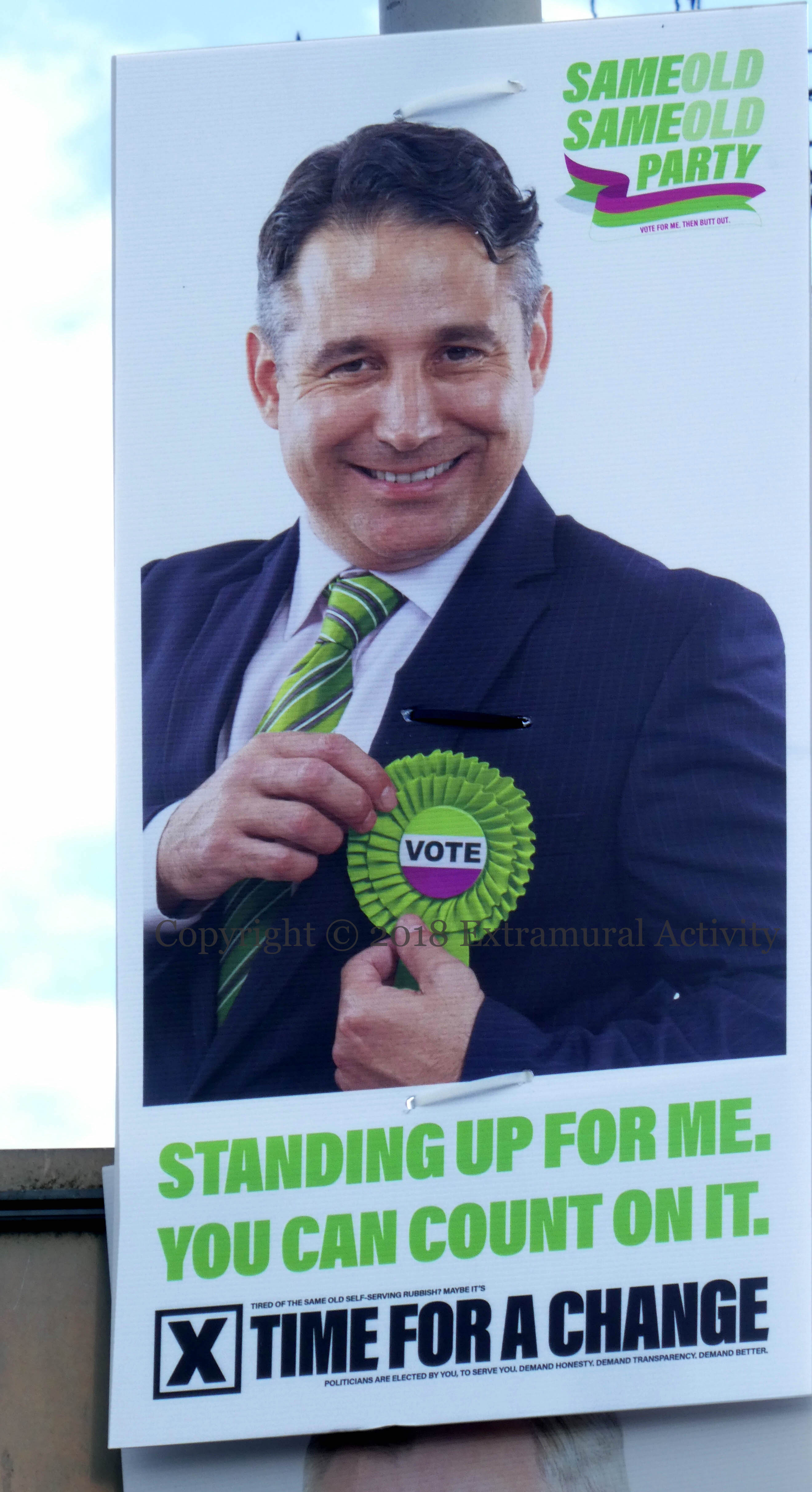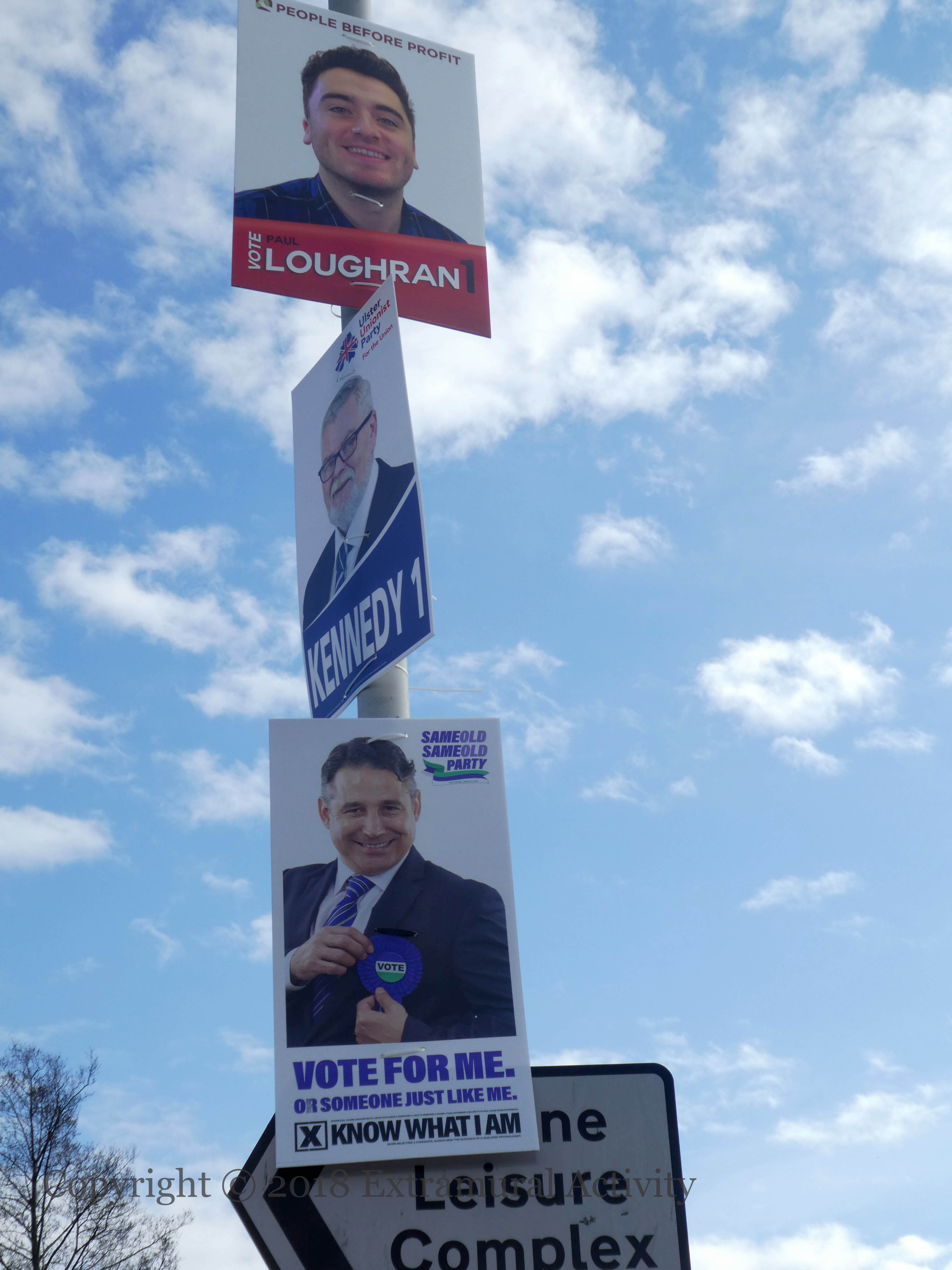Local elections take place two weeks from today, on Thursday May 2nd. Some are fed up with the political status quo: “Tired of the same old self-serving rubbish? Maybe it’s time for a chance. Politicians are elected by you to serve you. Demand honesty, demand transparency, demand better.” The “blue” (unionist) candidate is described as having “superficial charm, egocentricity, untruthfulness & insincerity, lack of remorse & shame, poor judgement, failure to plan & learn from experience” and voters are counselled “when electing a candidate, always seek the advice of a qualified psychologist.” The placards are posted on Ormeau bridge, between nationalist lower Ormeau and unionist Annadale. At the top of the light-pole, actual candidate Paul Loughran is standing from People Before Profit, which we have seen before advertising in both loyalist and republican areas: see Pick And Mix.