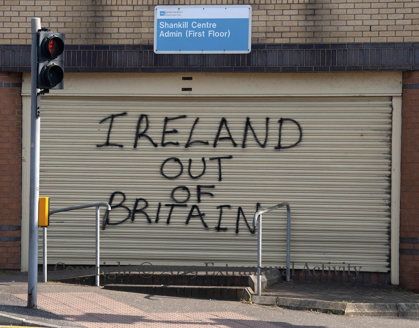 Sınn Féın leader Mary Lou McDonald drew criticism for appearing behind an “England get out of Ireland” banner at the St Patrick’s day parade in New York city (BBC-NI). This Shankill Road graffiti reverses the sentiment (replacing “Britain” with “England”), commenting perhaps on the difficulty the Northern Ireland border poses for the UK’s attempt to exit the European Union.