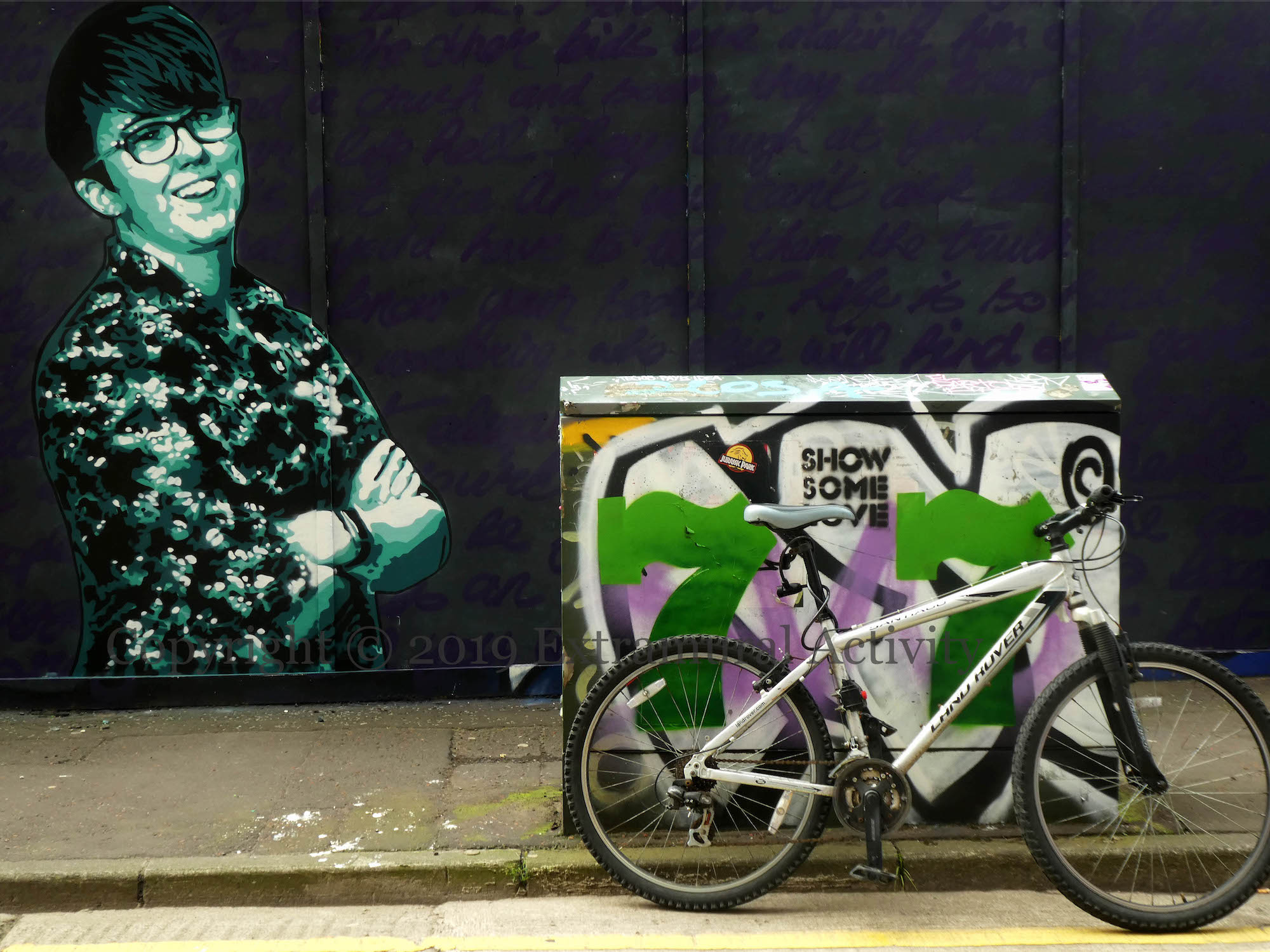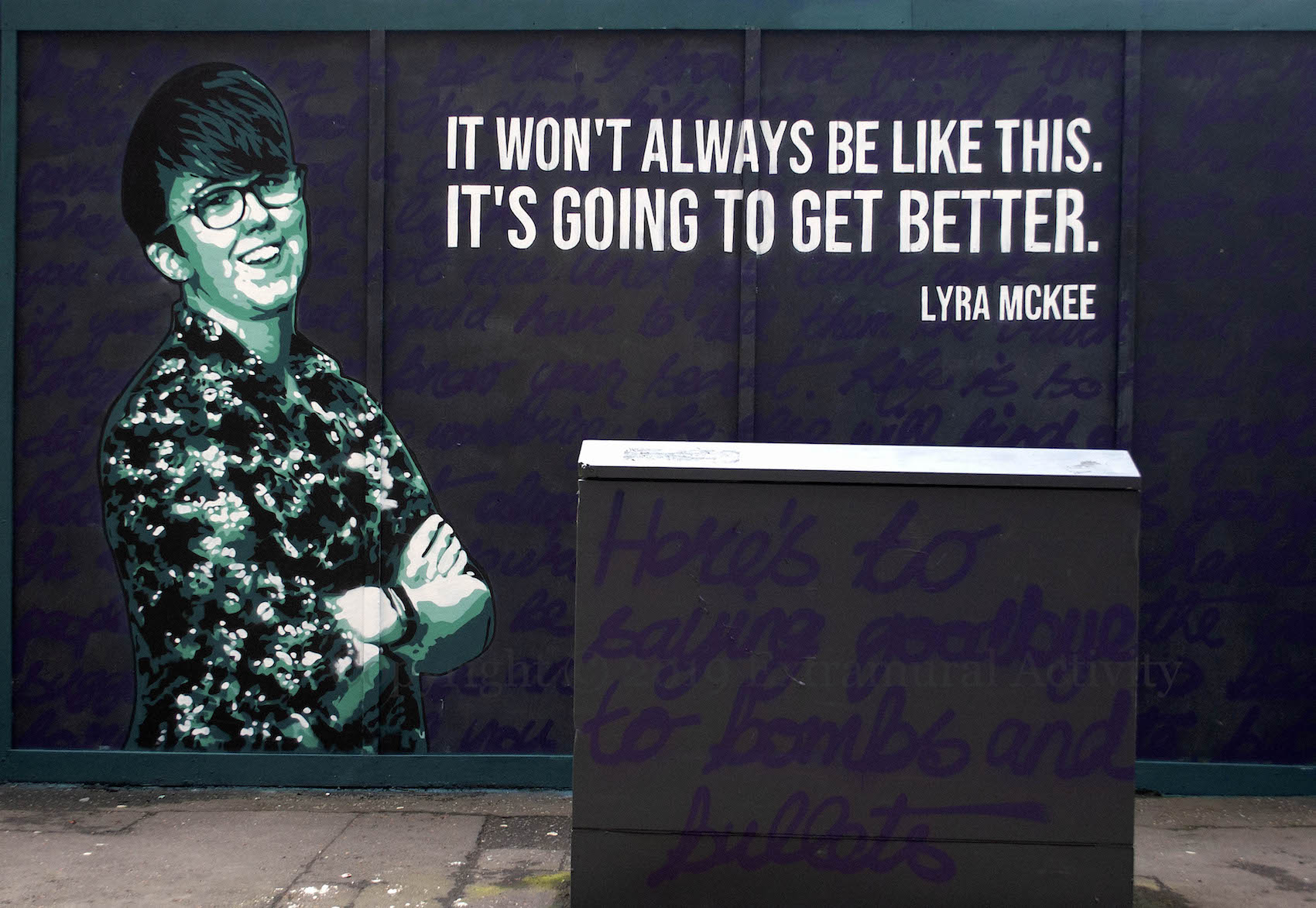 Later in the process the electrical box was painted over in keeping with the piece (“Here’s to saying goodbye to bombs and bullets”) and a quotation added to the main piece: “It won’t always be like this. It’s going to get better – Lyra McKee.” See the final two images, below.