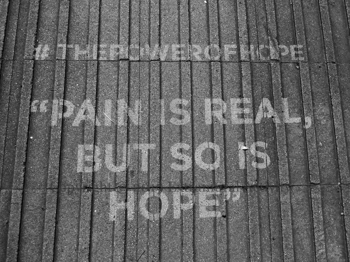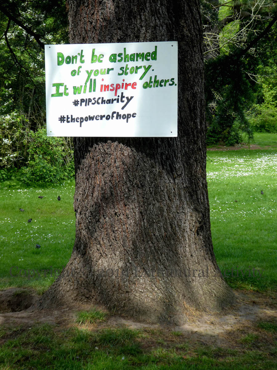 “Don’t be ashamed of your story – It will inspire others.” “You are amazing – remember that.” The Belfast ‘Darkness Into Light’ event for suicide-prevention (a walk to greet the sunrise) was held in Ormeau Park on May 11th, and the park was decorated with lots of inspirational messages and stencils from organisations including PIPS (Public Initiative For Prevention Of Suicide And Self-Harm tw | Fb) and Pieta House (web | tw) (with electric ireland).