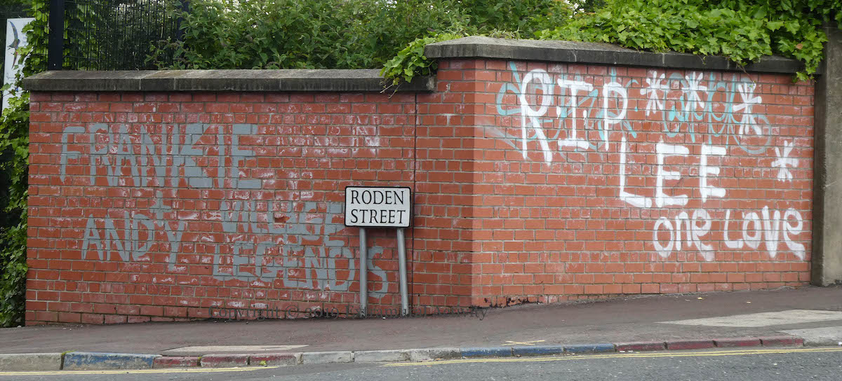 “Frankie + Andy – Village legends.” UVF hitman Andy “Hard To Kill” Aiken died of a drugs overdose in June 2018, six months after the death of his brother Andy (BelTel) who lived in Roden Street (Funeral Times). The graffiti was previously to Frankie alone (Street View).