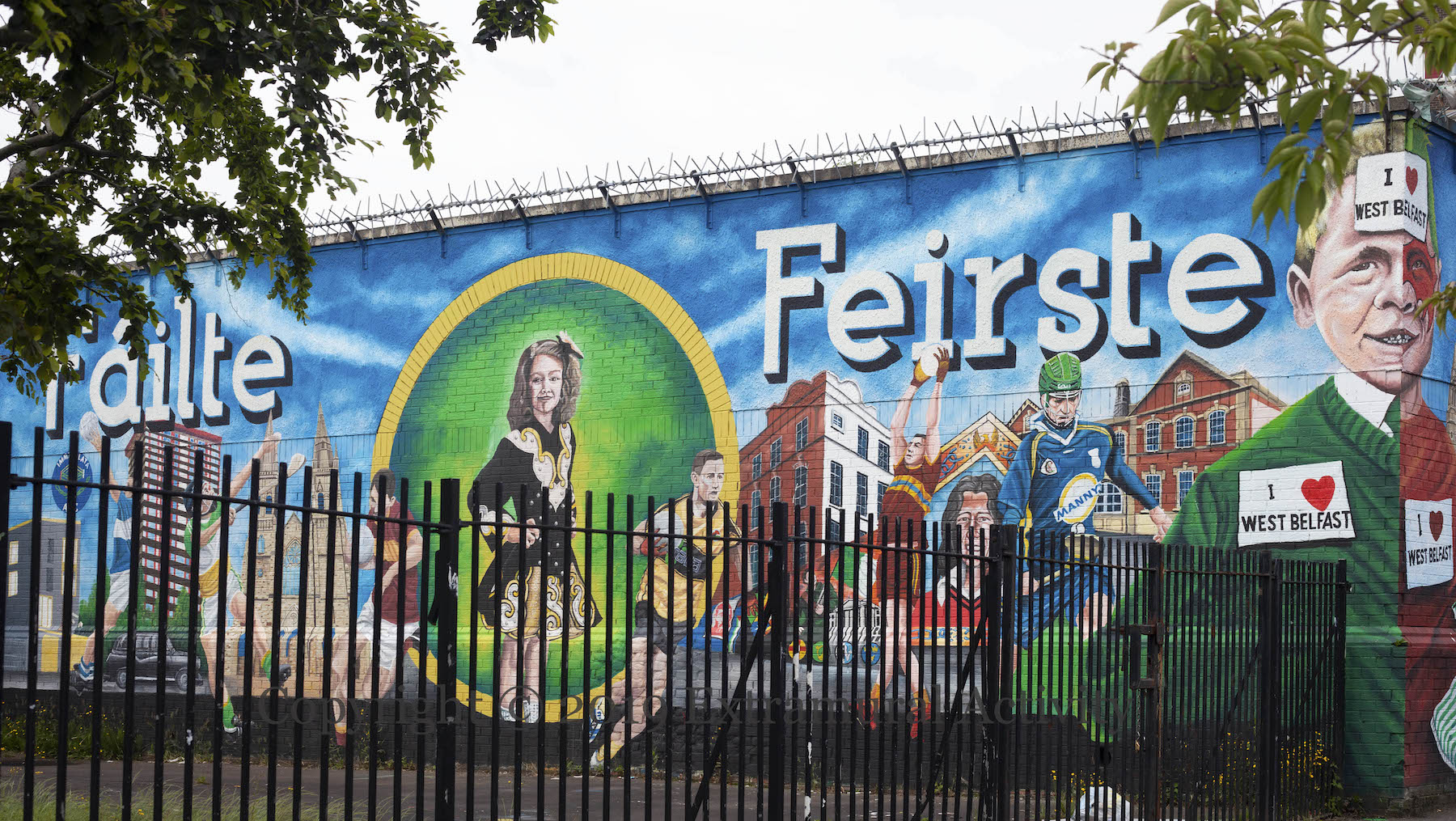The mural is a mix of landmarks – the new Raıdıó Fáılte building (which is located just below the mural), Divis tower, St Peter’s, Conway Mill, the so-called “international wall” of murals, the Bobby Sands mural, the Falls library, the new James Connolly centre, Cultúrlann, and Milltown cemetery – cultural images (Irish dancing and Féıle An Phobaıl) – and sporting images (clubs include Immaculata ABC, Gort Na Móna GAC, St Paul’s GAC). A gay pride ‘rainbow’ stripe runs below the Divis Street portion. Before the previous mural was painted (M07533), there was a Gateway To Belfast board at this spot.