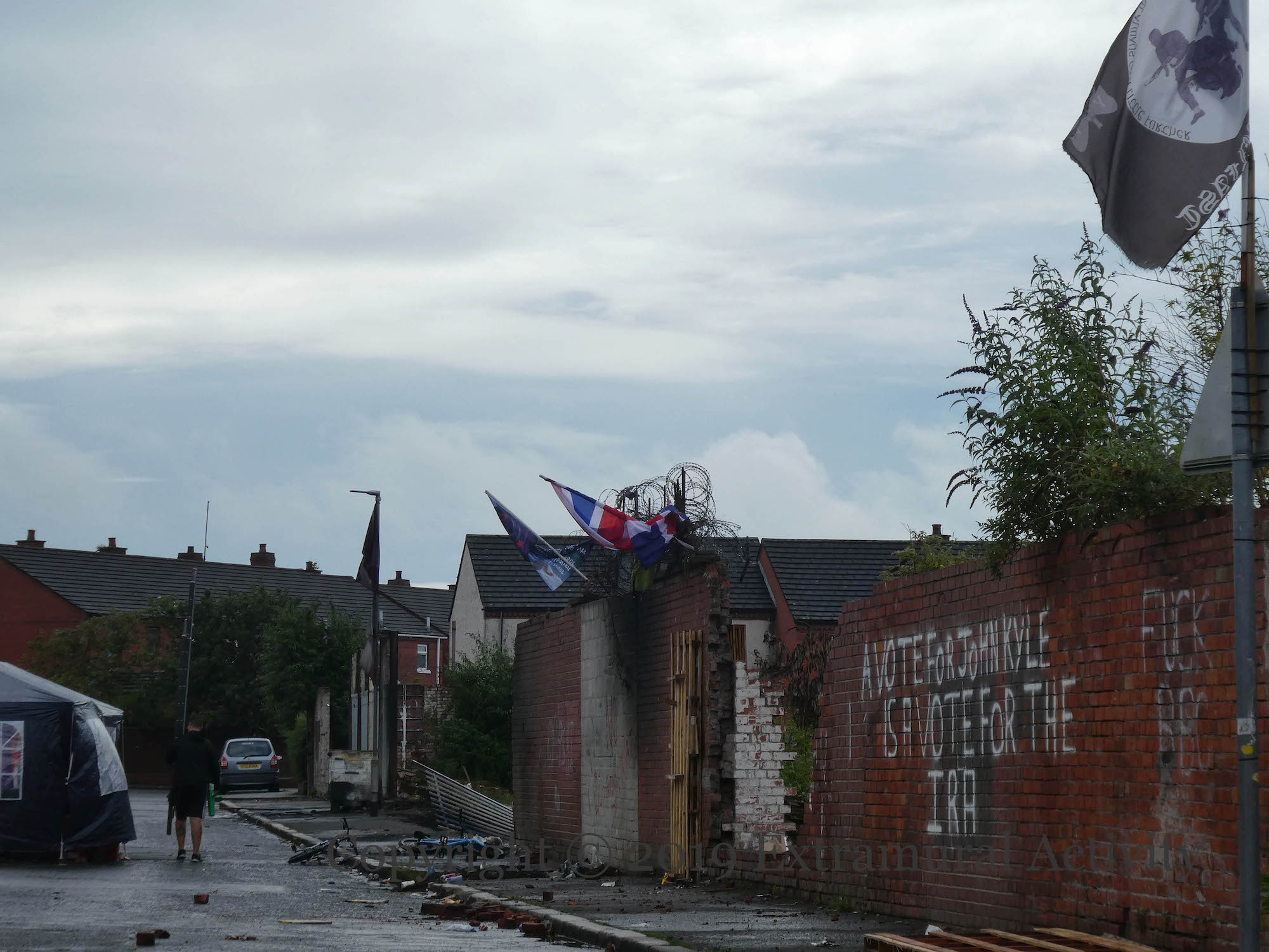 1,800 tyres were removed from the bonfire in Lismore Street this week by contractors in “armoured Land Rovers” (according to by Robert Girvin, East Belfast Cultural Collective, to the BBC; see this gallery of images at Belfast Live) working for Belfast City Council. PUP councillor John Kyle spoke out in favour of their removal (twitter | Belfast Live). Local residents have interpreted his comments as treasonous, with three pieces of graffiti painted in the area, one on Roseberry Road next to Young’s fish and chips (above), one on London Road (below), and one at the bonfire site on Lismore Street (final image): “A vote for John Kyle is a vote for [the] IRA.” The graffiti has been criticised by unionists – PUP | DUP – though Jamie Bryson suggested that the Council was pushing unionists and the PSNI into conflict.