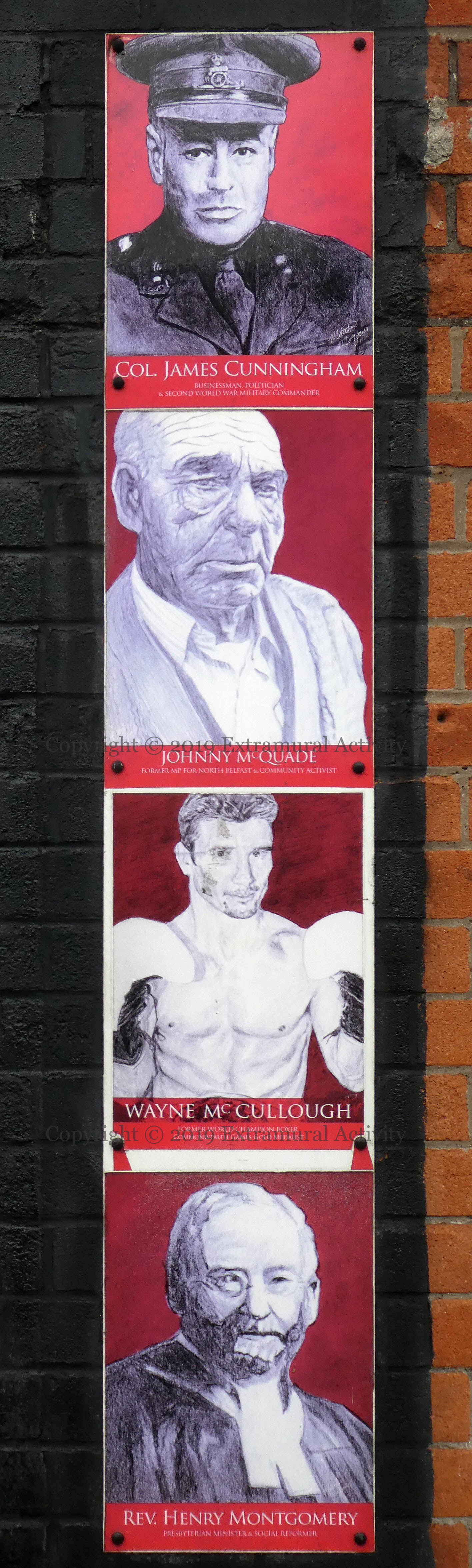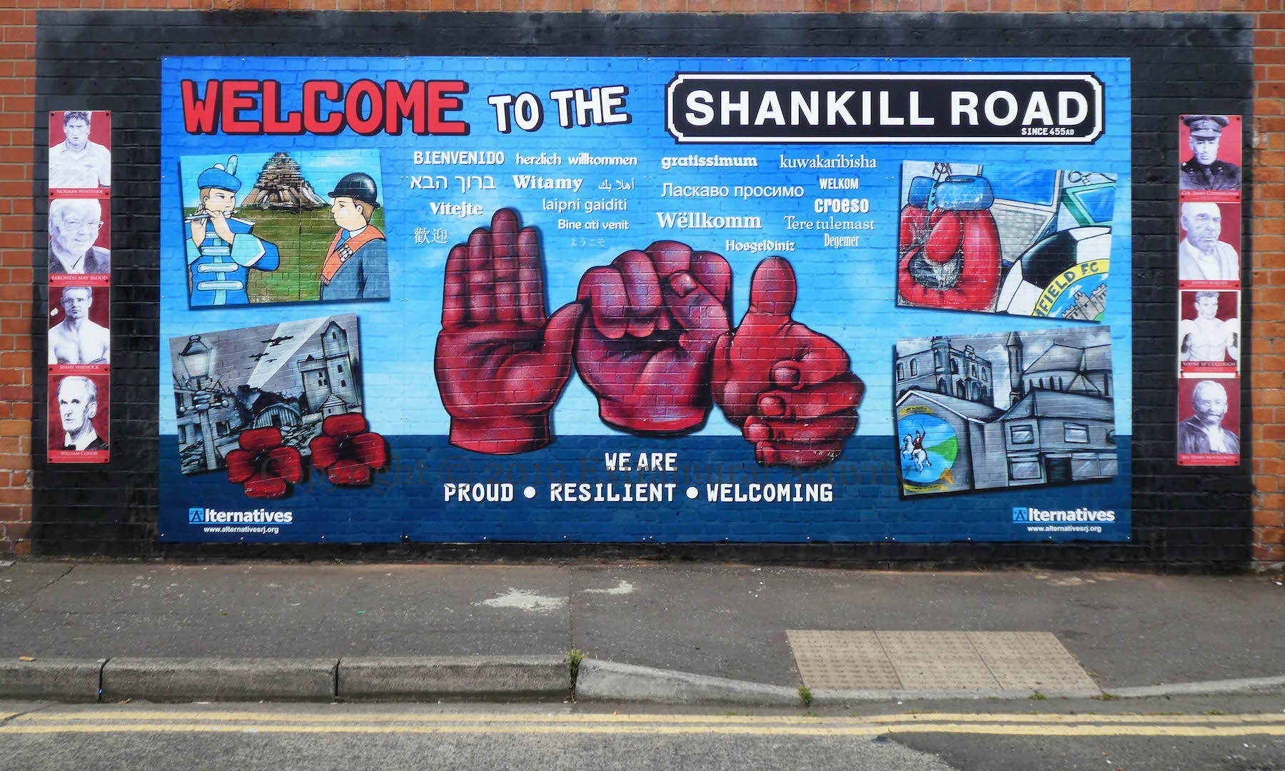 The mural is a version of the old Beverley Street ‘welcome’ mural (by Blaze FX), with the same four panels (parades/bonfire, blitz, sports, murals) and the same three hands. But instead of “Proud, Defiant, Welcoming” we now have “Proud, Resilient, Welcoming”. (I Am Not Resilient in the lower Shankill complains that the word is used to justify neglect and/or maltreatment.)