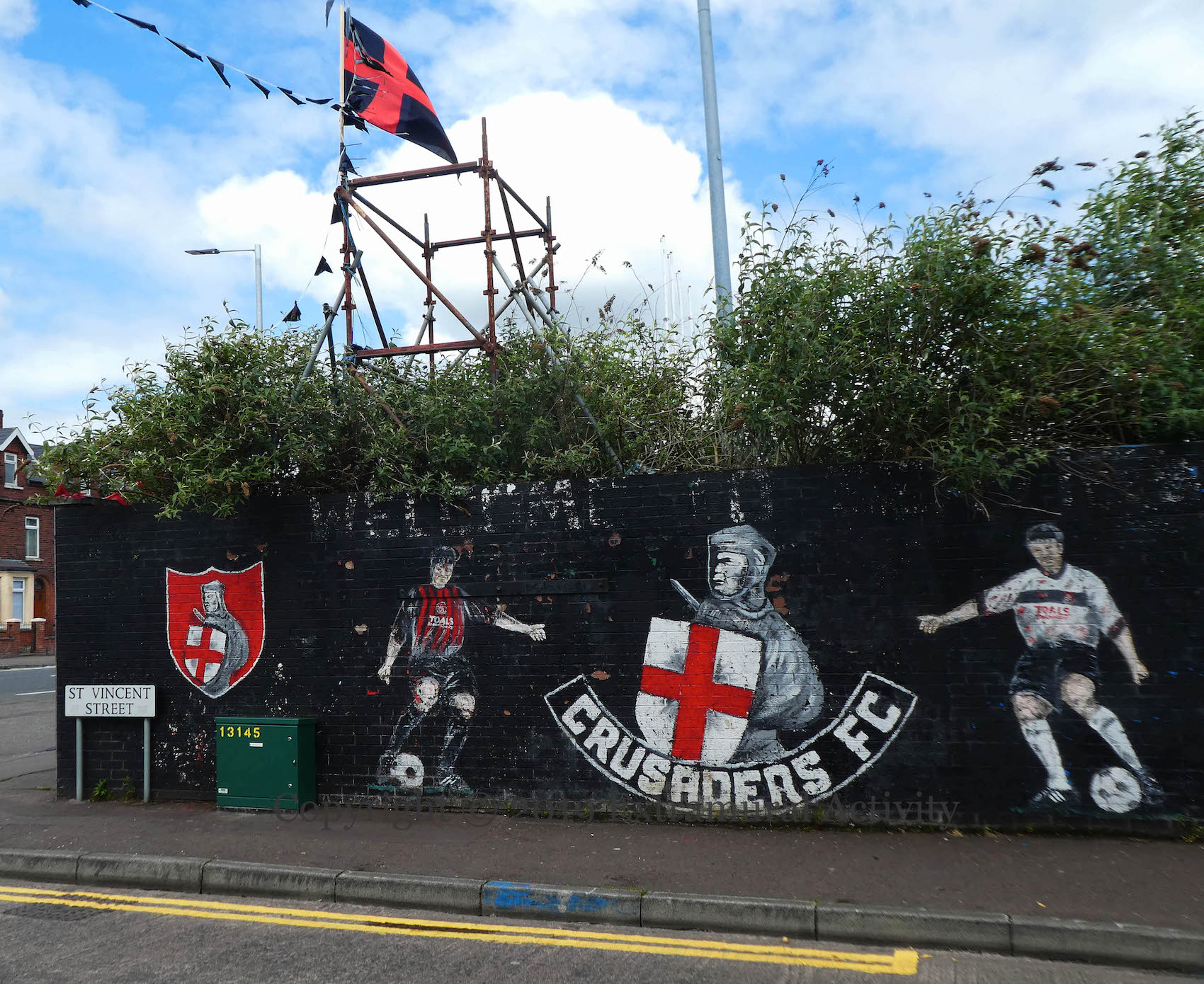 Crusaders – off to a perfect start of two wins – travel the mile and a half across north Belfast to Solitude to play Cliftonville at 3 this afternoon in the north Belfast derby. Today’s images are of the mural outside Seaview and the scene from the run-up to the team’s Irish Cup win over Ballinamallard (BBC-NI). In meetings between Crusaders and Cliftonville, Crusaders lead 151 wins to 84 (WP).
