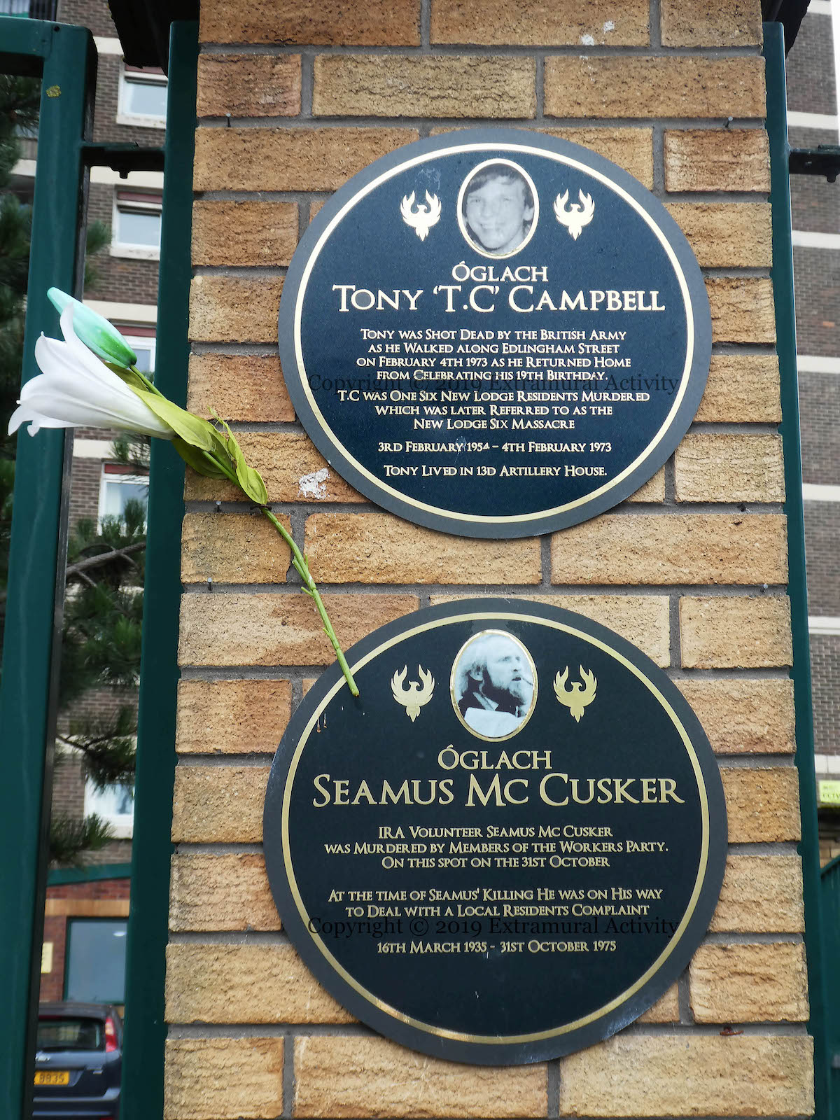 “Óglach Tony ‘TC’ Campbell was shot dead by the British Army as he walked along Edlingham Street on February 4th 1973 as he returned home from celebrating his 19th birthday. TC was one [of] six New Lodge residents murdered which was later referred to as the “New Lodge Six Massacre. … Tony lived in 13D Artillery House [now Teach Ghráınne].” Campbell was hit 17 times (BBC).