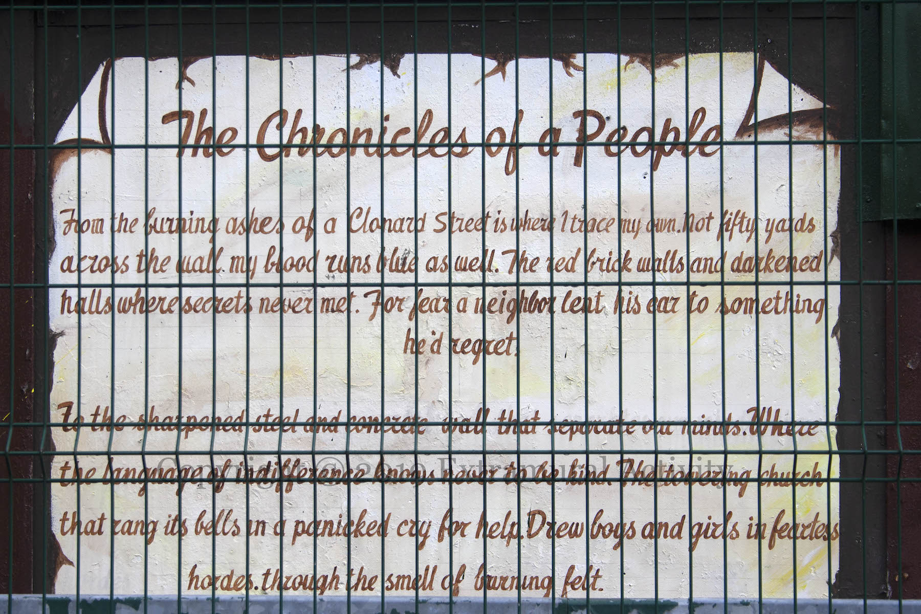 “From the burning ashes of a Clonard Street is where I trace my own. Not fifty yards across the wall, my blood runs blue as well. The red brick walls and darkened halls where secrets never met. For fear a neighbor lent his ear to something he’d regret.//