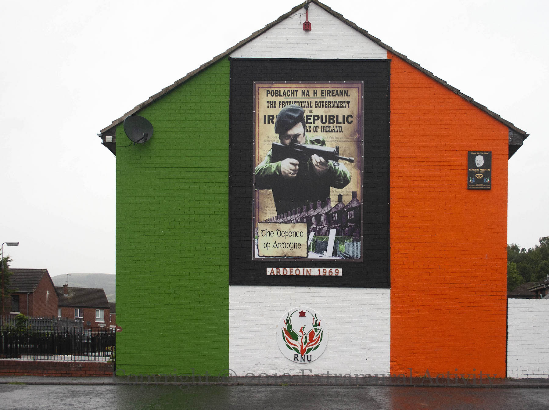 After a few years honoring Seán McCaughey (see Chains And Bonds Have No Part In Us), Martin Meehan’s image (along with an RNU phoenix) is back on the Ardoyne Avenue gable that bears his plaque. The title of this entry post is based on the song “The Night We Burnt Ardoyne“.
