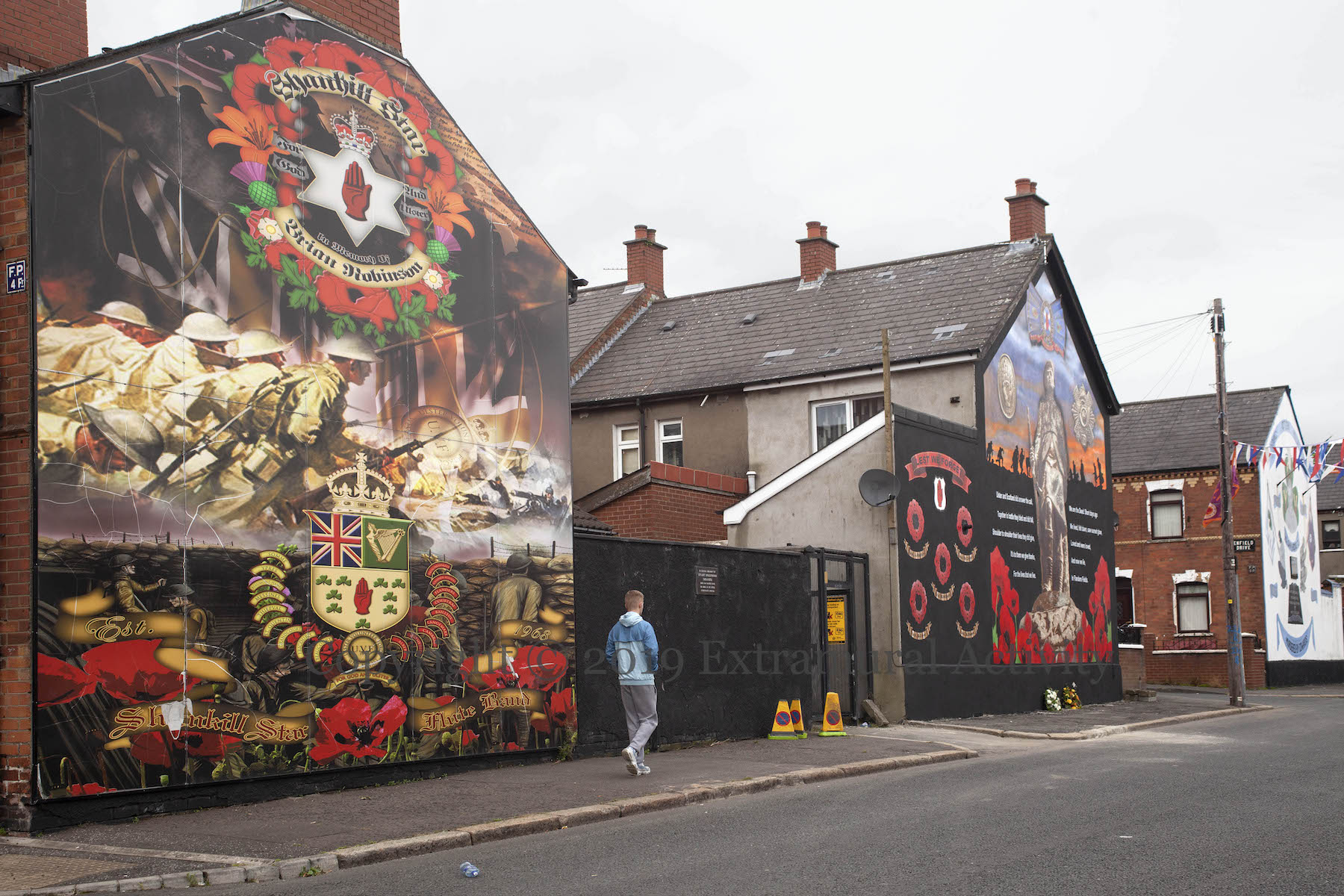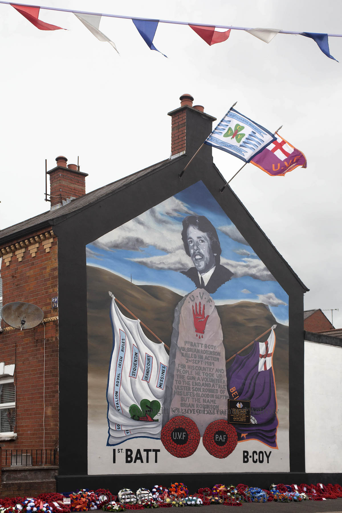 Garlands of flowers rest at the base of the (upper) mural to UVF volunteer Brian Robinson on the thirtieth anniversary of his death, on September 2nd, 1989, by a British Army undercover unit, moments after he had shot and killed a Catholic civilian named Patrick McKenna on the Crumlin Road (WP).