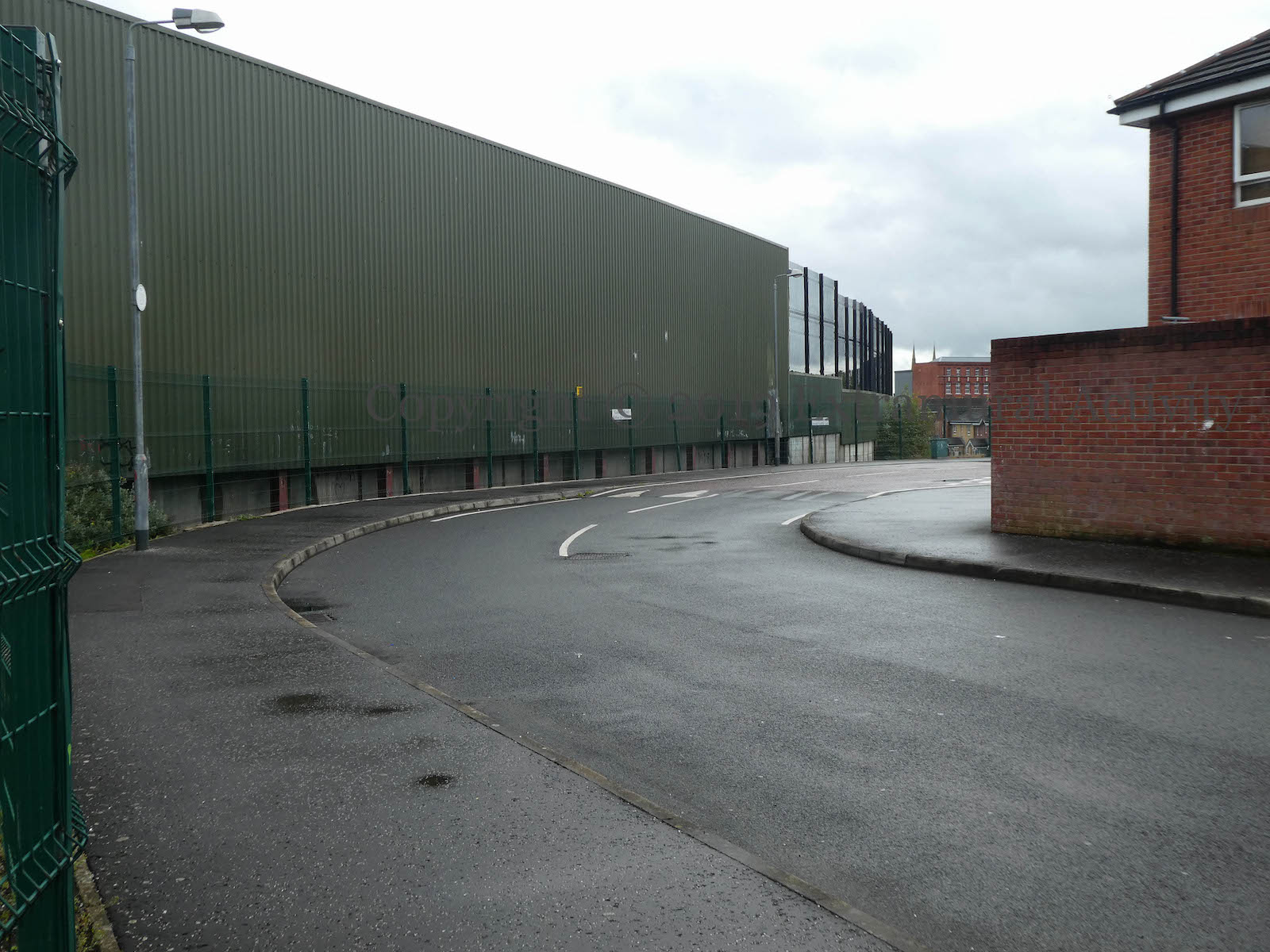 Here are two images of the “peace” line at the middle and eastern end of Bombay Street. If you want more such images, Frankie Quinn’s exhibition of images of the “peace” lines – Cordon Sanitaire – continues at Belfast Exposed in Donegall Street until October 5th.