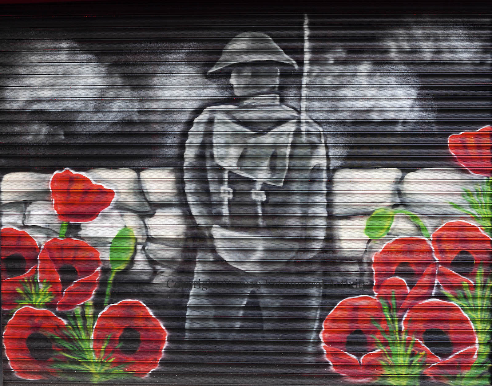 Thoughts Awe Hame 2019-10-192024-12-28Extramural Activity This contemplative WWI soldier is the mural part of a new memorial commemorating fallen UVF volunteers from Scotland. On the shutters of the Pizza Cabin on the Shankill. Click image to enlargeCopyright © 2019 Seosamh Mac CoılleX06842 Rate ThisShare this: Click to email a link to a friend (Opens in new window) Email Click to share on Mastodon (Opens in new window) Mastodon Click to share on Reddit (Opens in new window) Reddit Click to share on Bluesky (Opens in new window) Bluesky Like Loading...