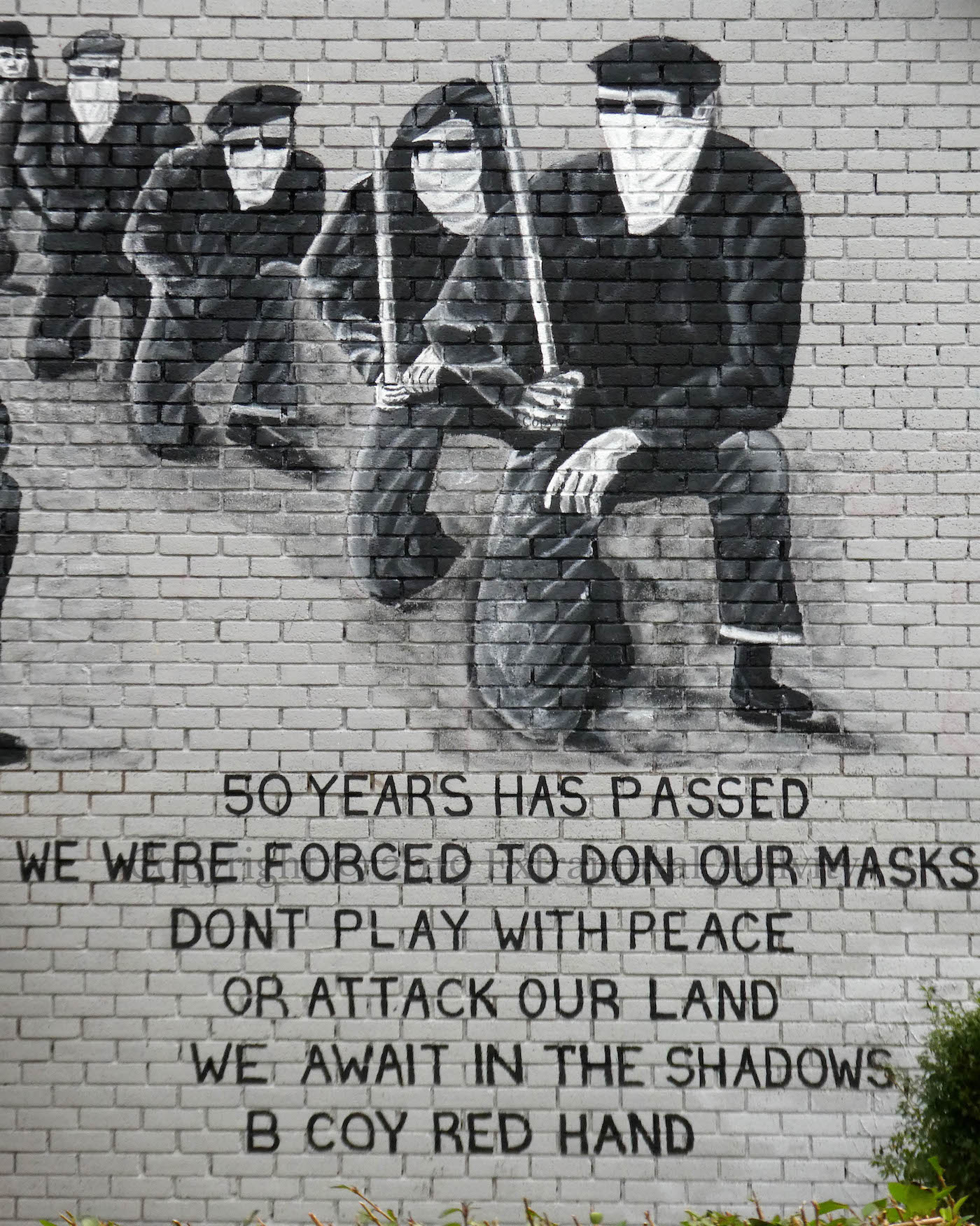 Ten years after ending its armed campaign, the Red Hand Commando in 2017 applied to be de-proscribed, on the basis that it had given up its arms in 2009 and transformed itself into an ‘old comrades association’ (see the emblem in the bottom left of the wide shot) (BBC | NewsLetter). According to this mural, however, B company is ready to reform in response to those who “play with peace”, fifty years later (or so – the mural claims the group was founded in 1970; other sources give 1972 (WP cites Peter Taylor).