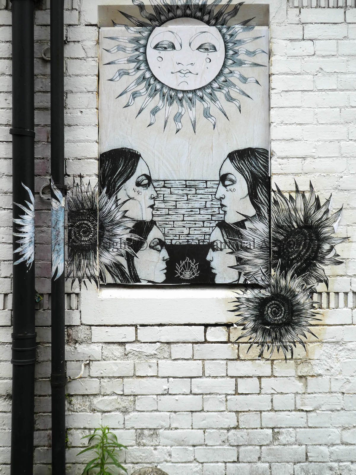 Sunflowers fare better than stoney-faced humans in the glare of the sun. Street art (perhaps by Niko the TMN member and one-time graffitist) on the outside wall of the Red Barn Gallery, off Rosemary Street.