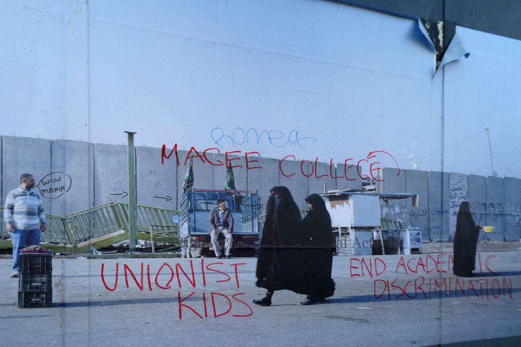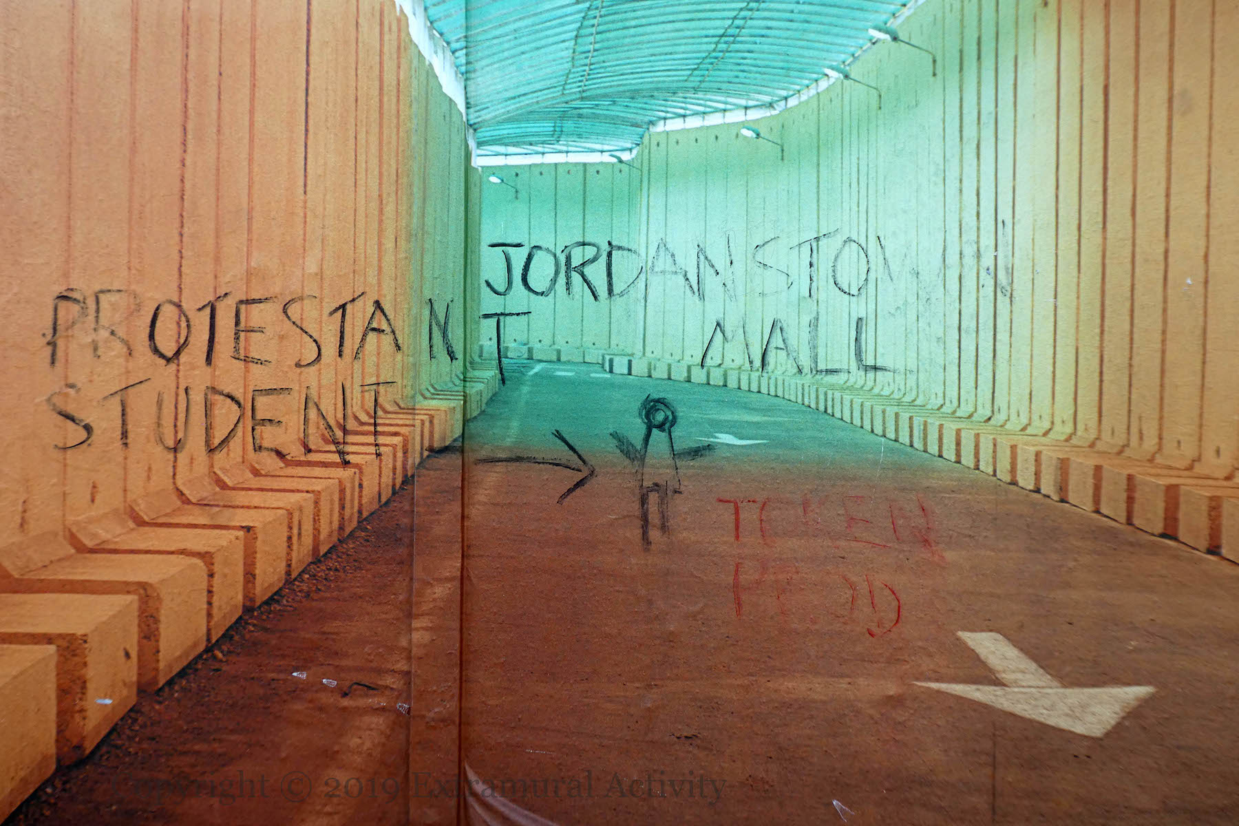 The resentment persists to the present day, as can been seen from the graffiti written on the panels of the Wall On Wall installation (see Wall On Wall | Confrontier | The Green Line) on the Cupar Way “peace” line, in which the dividing lines around the world are labelled with the universities on one side and the “unionist kids”, “Protestant working class” (for whom migration is less of an option, perhaps), “token Prod”, and “Protestant manual labourers”, on the other. Deirdre Robb of Belfast Exposed expressed disappointment at the graffiti (Irish News).