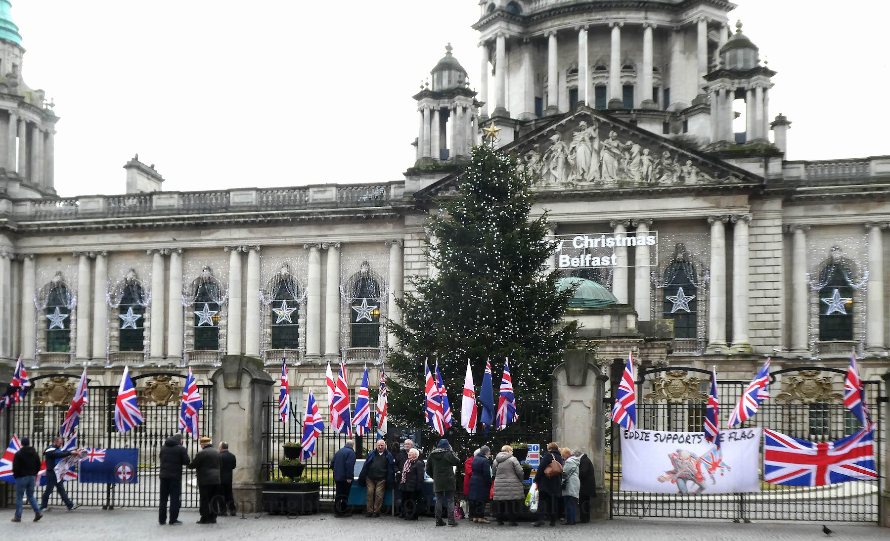 “Happy Christmas, Belfast.” A time of mythical creatures and twelve days of gifts. On the seventh anniversary of the flag protests (in response to a vote by the Council to fly the Union Flag from city hall only 18 days a year as in the rest of the UK) my true love gave to me a dozen or so Union Flags (and a few Ulster Banners) attached to the railings. Santa was nowhere to be seen but, as is fitting for a zombie, Eddie The Trooper continued to stalk the land. For Eddie’s previous appearances, see his Visual History page.