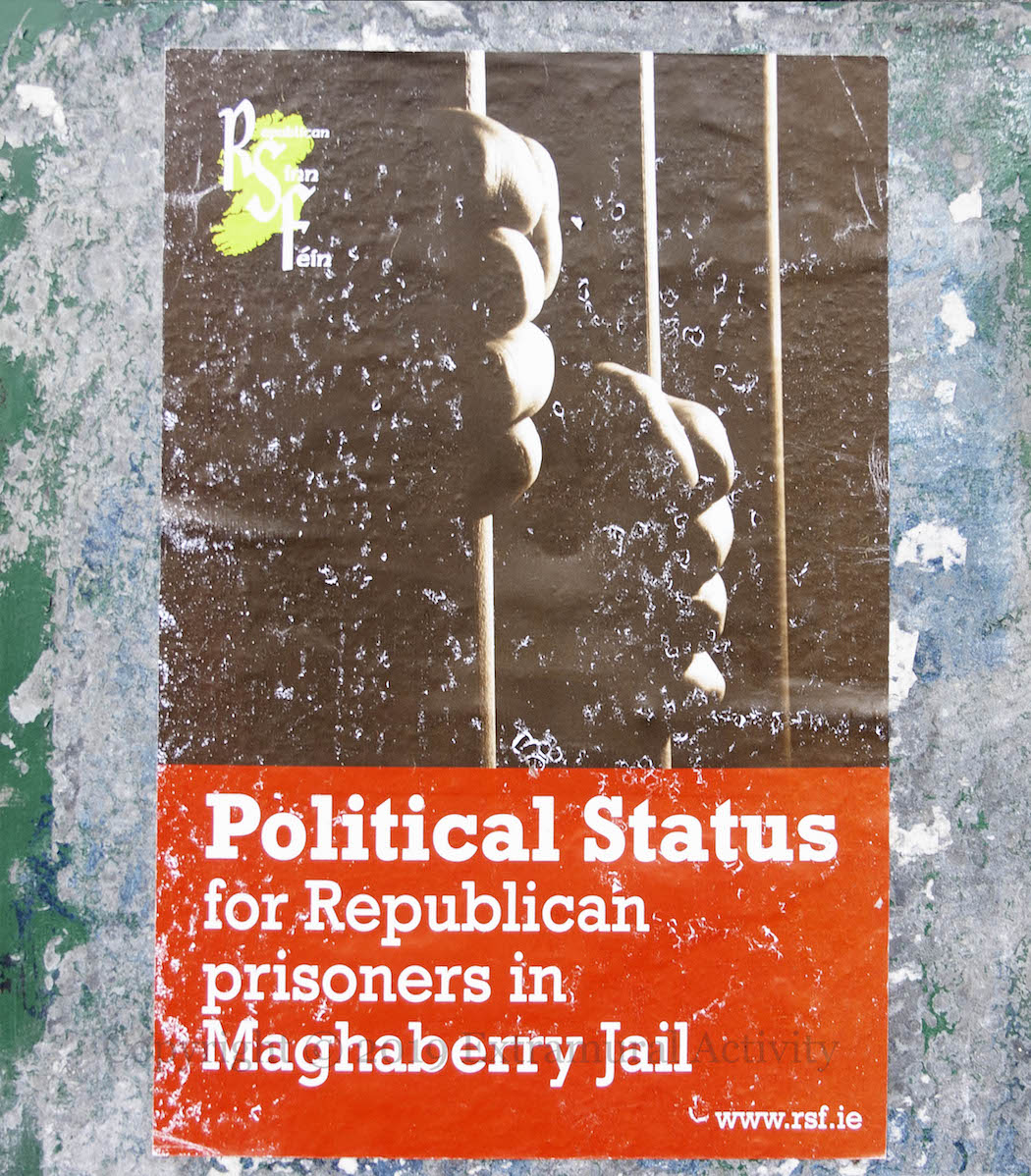 Republican Sınn Féın and Provisional Sınn Féın were formed in 1986, when Sınn Féın split over the issue of taking Dáil seats. They reject the Belfast Agreement and support the use of force; the poster above calls for political status for prisoners, the same issue that led to the blanket protest and hunger strikes. (Their web site is in fact republicansinnfein.org; they are also on Twitter.)