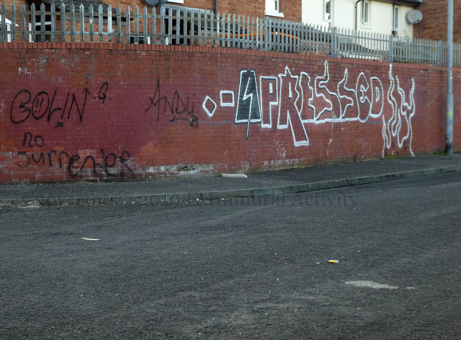 Conway Street used to run all the way from the Falls to the Shankill but was divided into two in response to the intense rioting of August 1969. Makeshift barriers were constructed along the Falls at the bottom of Conway Street and others, soon to be replaced by the permanent barrier. Although the so-called “peace” line largely does its job, the wall is itself a form of oppression to those living in its shadow. “No surrender” to the op(p)ressors. Graffiti on Conway Street above (i.e. Shankill side of) the “peace” line.