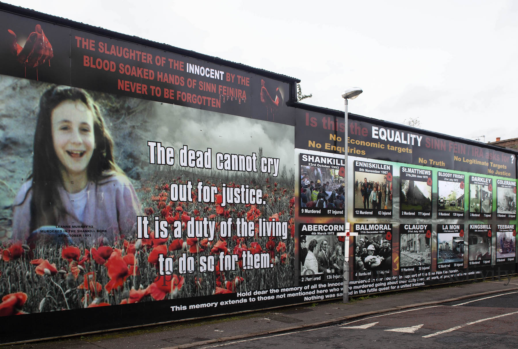 Photographs of a dozen atrocities are included on the right of this Derwent Street mural, ranging in time from the 1970 gun-battle around the nearby St Matthew’s church in 1970, in which Jimmy McCurrie and Bobby Neill were killed, to the October 1993 IRA bombing of Frizzell’s fish shop on the Shankill Road, in which Leanne Murray (shown on the left) was one of ten people, two of them children, to die. The others incidents portrayed are Bloody Friday, Darkley, Coleraine, Abercorn, Balmoral, Claudy, La Mon, Kingsmill, and Teebane.