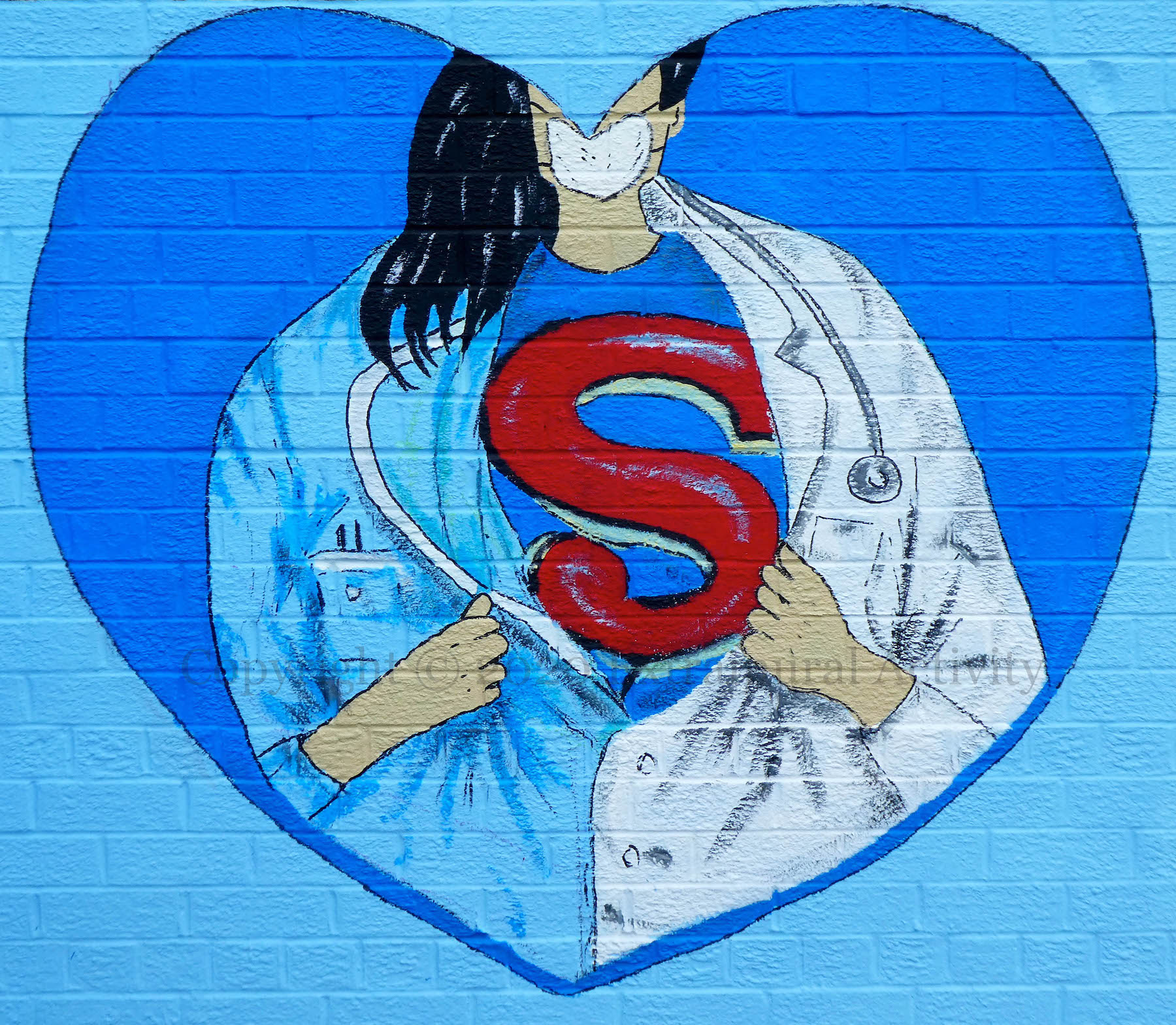 Coronavirus places ordinary people such as health-care workers and employees of essential businesses in extraordinary times. This new Mount Vernon mural thanks NHS staff by depicting them as supermen and -women in disguise.