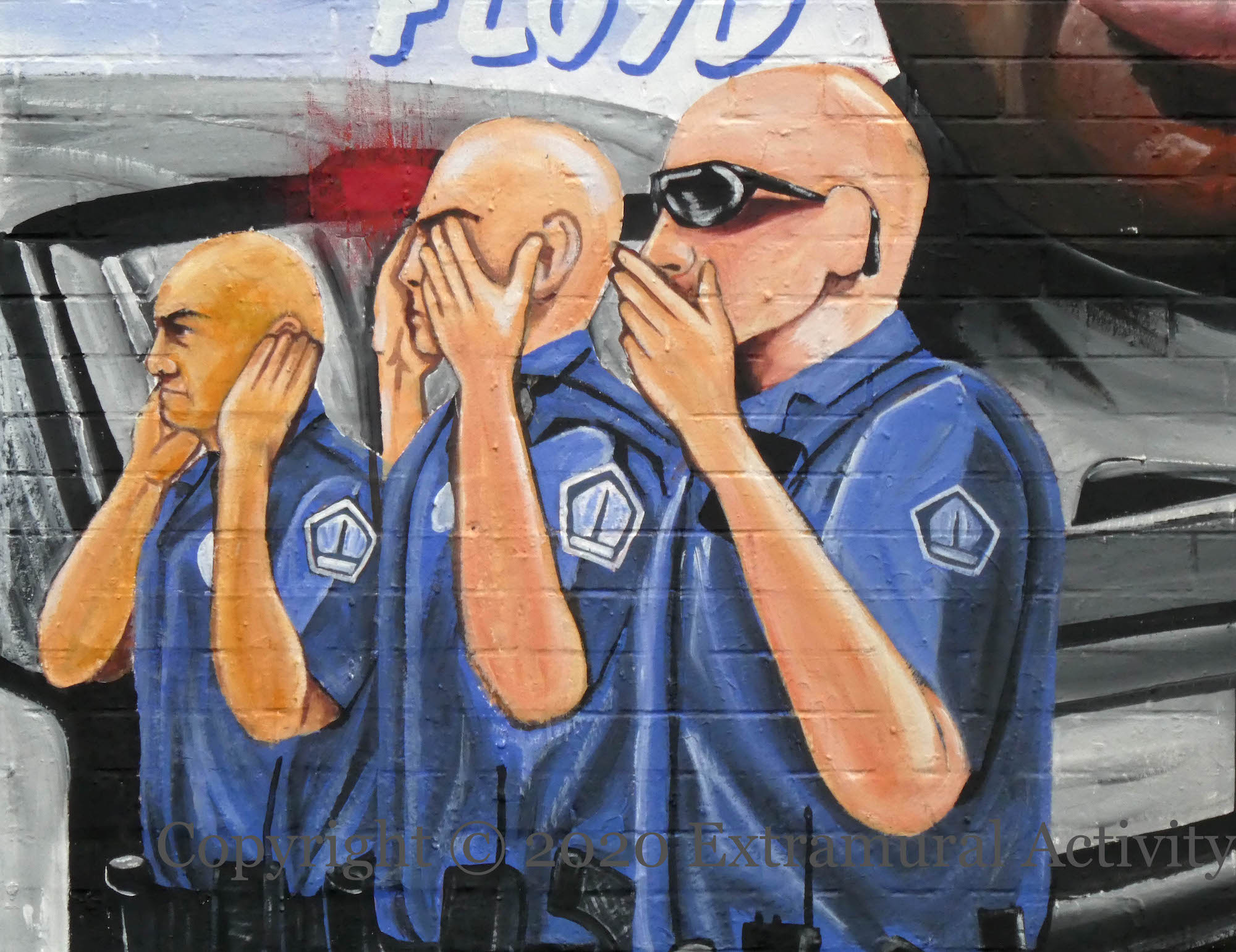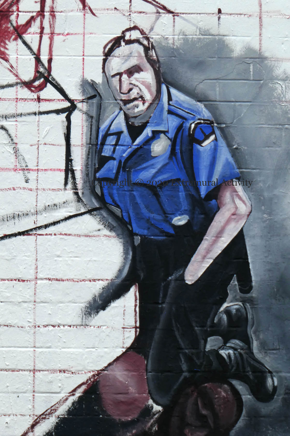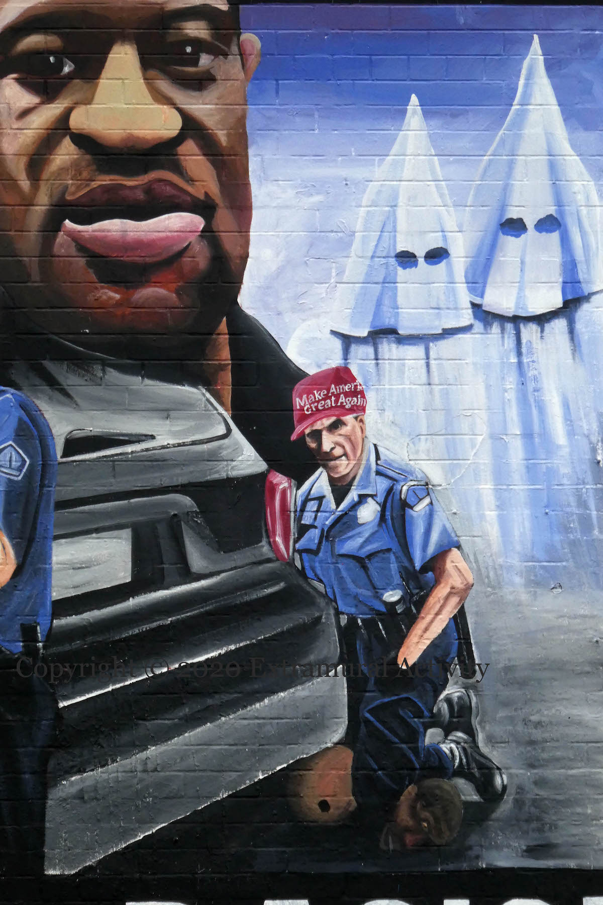 As the in-progress shots show (below), Chauvin was originally painted with sunglasses on his head but these have been replaced by a MAGA cap. Two members of the Ku Klux Klan appear in the top right. Three officers with shaved heads and Minneapolis PD (“City of lakes”) badges are shown on the left in the poses of the three monkeys Mizaru, Kikazaru, and Iwazaru who hear no evil, see no evil, speak no evil.