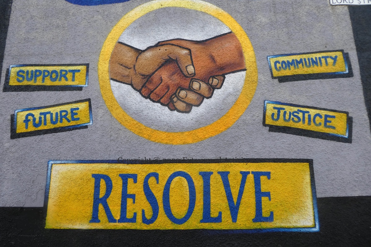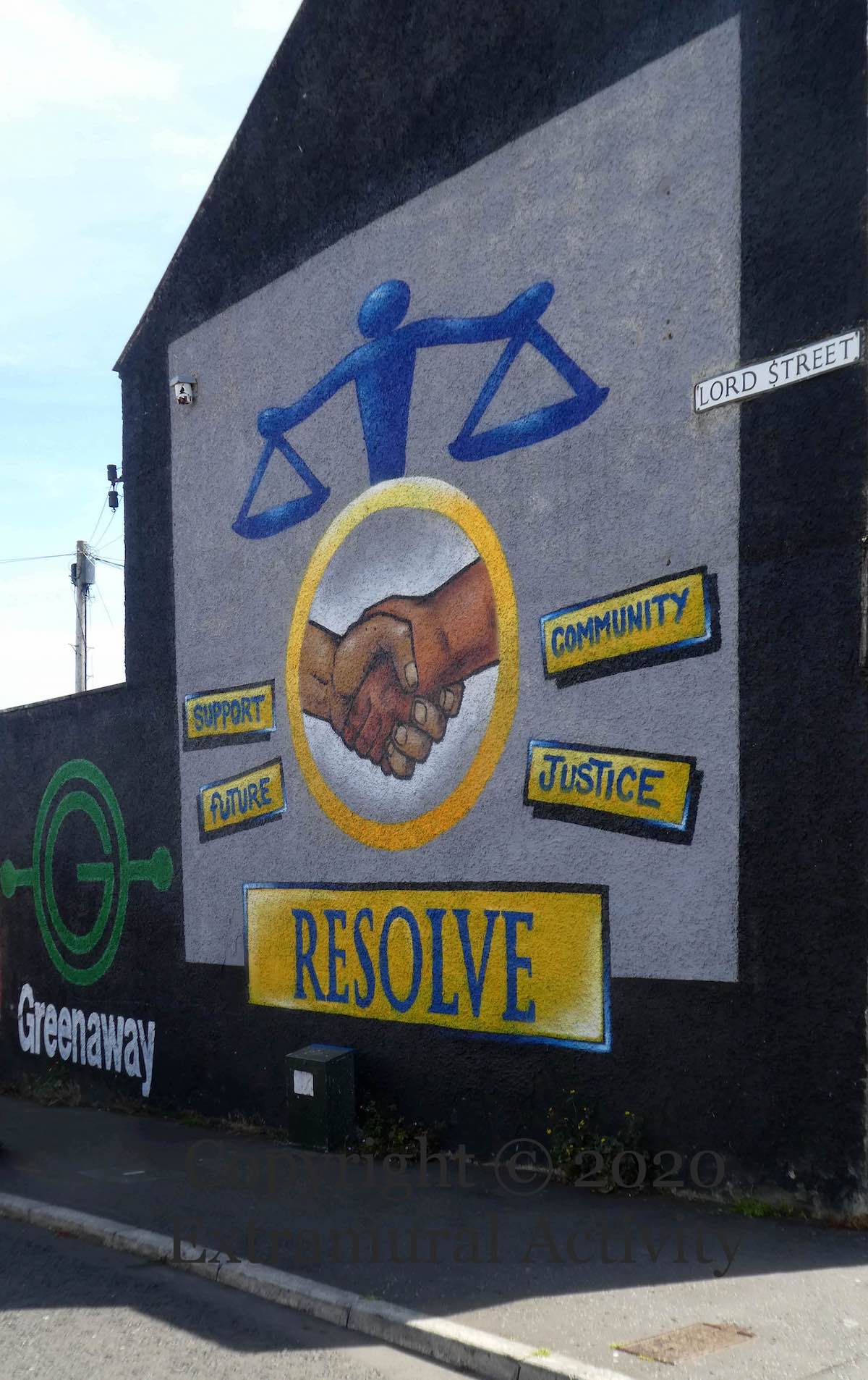 “Support. Future. Community. Justice.” Resolve NI (Fb) is a community-based restorative justice group, based in east Belfast, focused on non-violent resolution and restoring community relationships (their offices were featured previously). The mural is by Blaze FX (web | Fb) in Lord Street (at Beersbridge Rd), with sponsorship from Greenaway Auto Electrics (Fb) whose side wall the mural is on.
