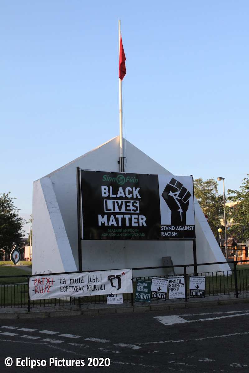 “Seasaıgí an fód ın aghaıdh an chıníochaıs – Stand [your ground] against racism”. The back of Free Derry Corner has been given a Sınn Féın board in support of the protests sparked by the killing of George Floyd in Minneapolis, Minnesota.