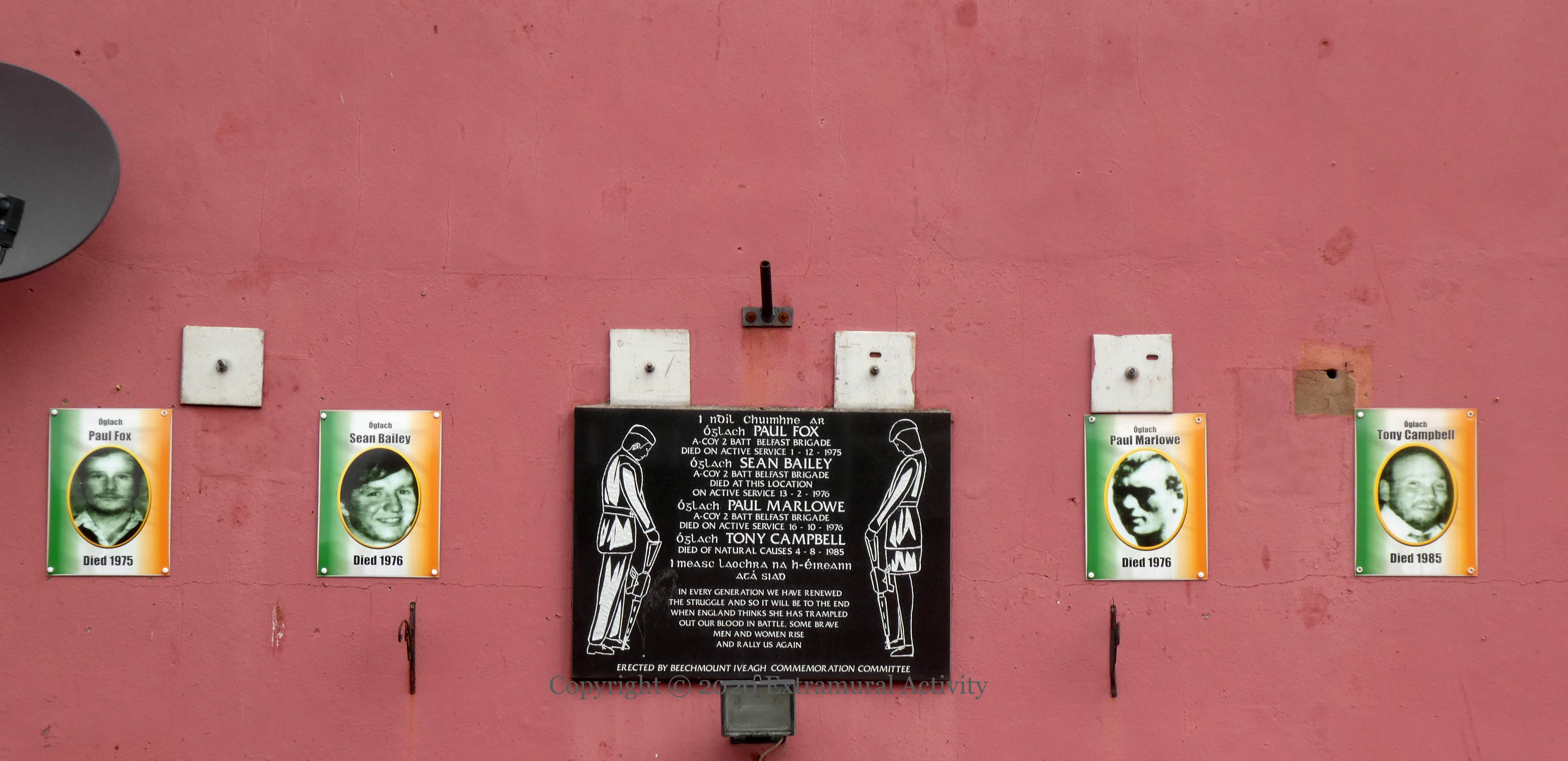 “I ndíl [ndıl] chuımhne ar Óglach Paul Fox A-Coy 2 Batt Belfast Brigade, died on active service 1-12-1975, Óglach Sean Bailey A-Coy 2 Batt Belfast Brigade, died at this location on active service 13-2-1976, Óglach Paul Marlowe A-Coy 2 Batt Belfast Brigade, died on active service 16-10-1976, Óglach Tony Campbell died of natural causes 4-8-1985. I measc laochra na hÉıreann atá sıad. In every generation we have renewed the struggle and so it will be to the end. When England thinks she has trampled out our blood in battle, some brave men and women rise and rally us again.”