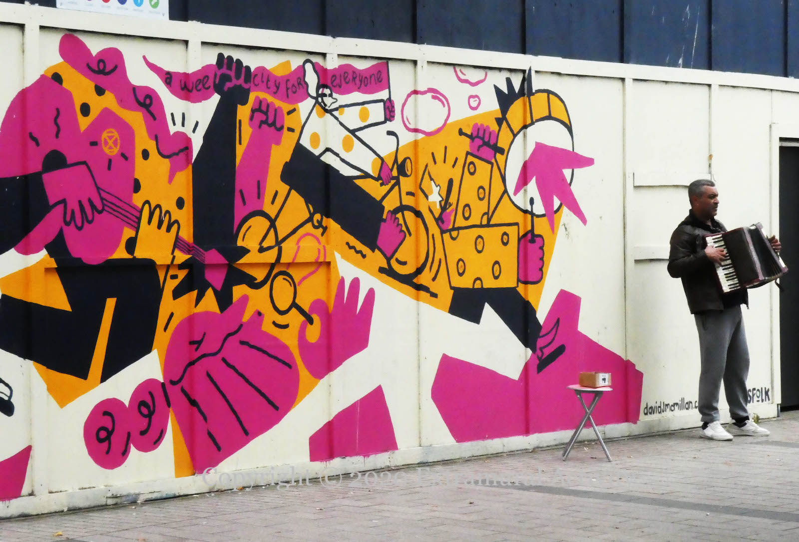 “A Wee City For Everyone”. The old BHS store in Corn Market, Belfast, is (still) being redeveloped. In the meantime, an accordion player joins David McMillan’s (web | ig) marching band on the hoarding around the site. Originally for Culture Night Belfast in 2019-09.