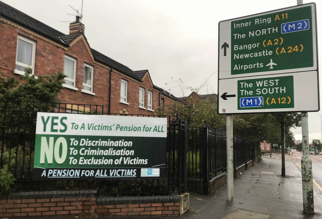 The pension plan for the injured of the Troubles was scheduled to open at the end of August, rather than the end of June, because of a dispute over the eligibility of those who suffered at their own hand. The Tar Anall boards shown here (in N Queen St and the Antrim Rd) recommend “a pension for all victims” but in the end, they were considered not to be eligible. Another source of the delay was the dispute over how the scheme would be funded (Irish Times | BelTel).