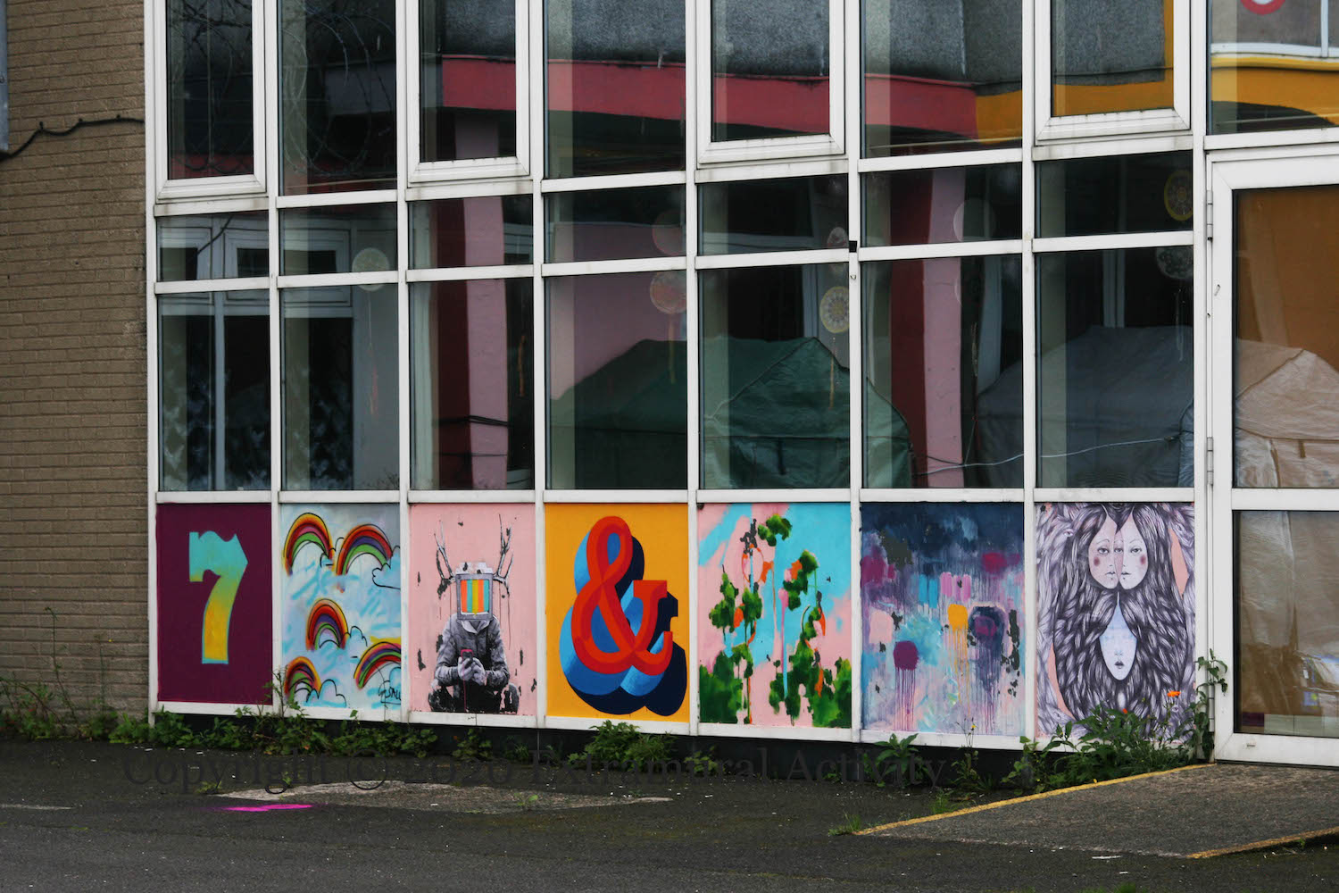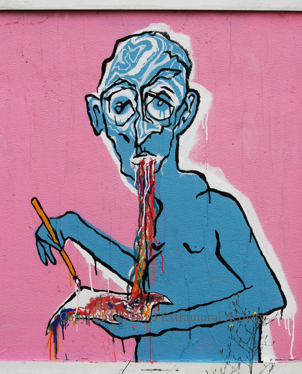 Artists from the arts collective Vault (web | tw) painted new pieces on the Tower Street side of the building in advance of the Summer Market on August 16th. Above is a Conor McClure painting of an artist puking up his creative guts. The piece in the middle is probably Leo Boyd. At the bottom is work by Dragoș Mușat.