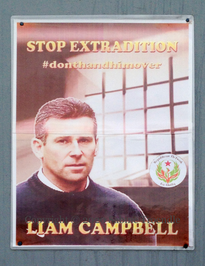 “Don’t hand him over. Don’t play England’s game. Stop the extradition of Liam Campbell now.” Liam Campbell is wanted, for a second time, in Lithuania on charges of running guns to the Real IRA in 2006-2007. He was arrested in Dundalk in December 2016 and will appeal his extradition in January next year (Irish Times). The posters of support are from Republican Sinn Féin and the Republican Network For Unity.