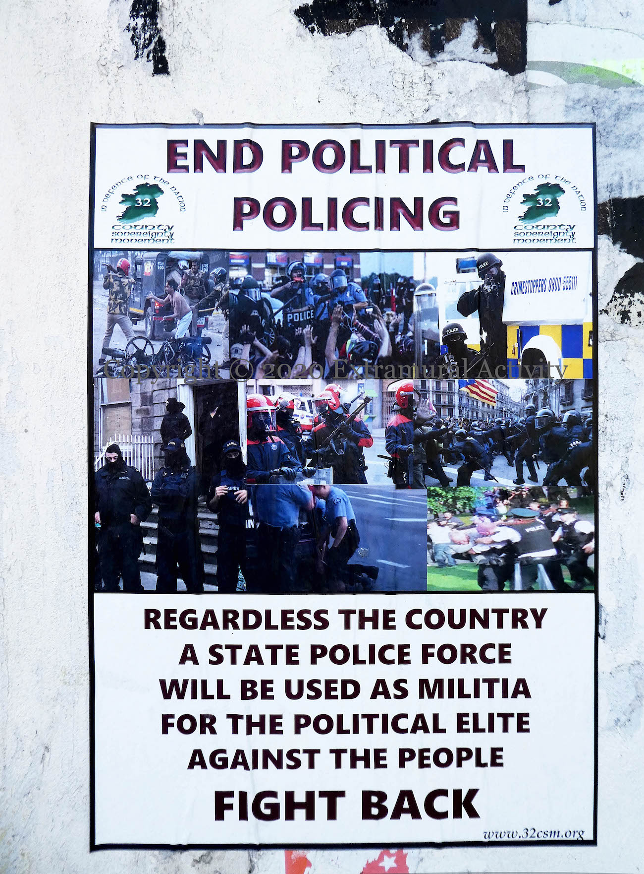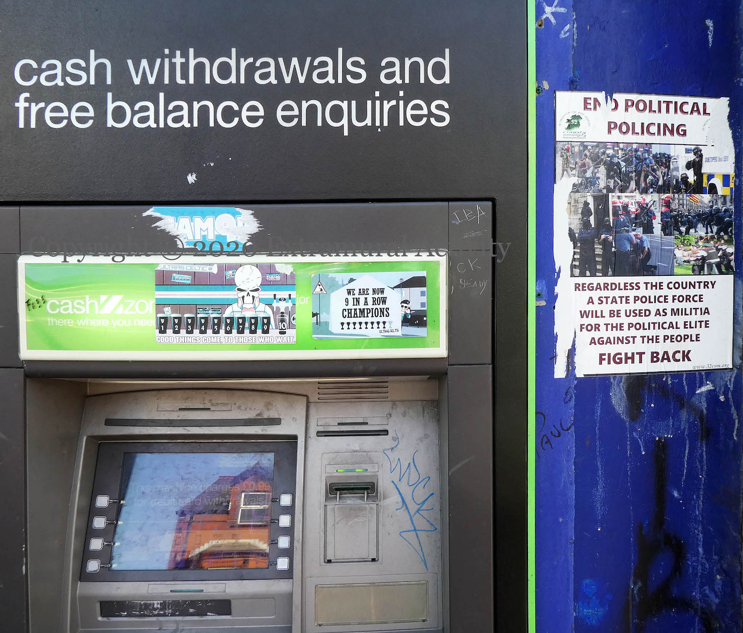 “Regardless the country, a state police force will be used as militia for the political elite against the people – fight back” – 32CSM poster with images of police brutality from around the globe, including the death of George Floyd. The stickers on the ATM itself are from Ultras Celtic/Green Brigade.