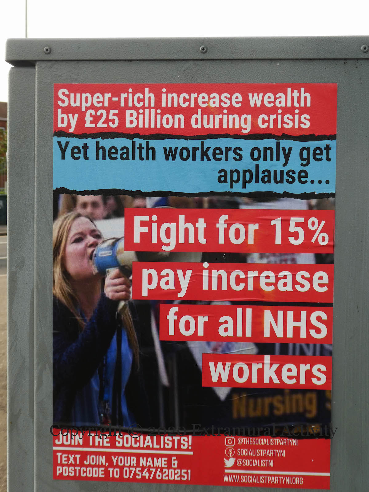 “Super-rich increase wealth by £25 Billion during crisis yet health workers only get applause … fight for 15% pay increase for all NHS workers.” “US super-rich increase wealth by $367 billion while workers lose lives, jobs, pay. End the rule of billionaires.”