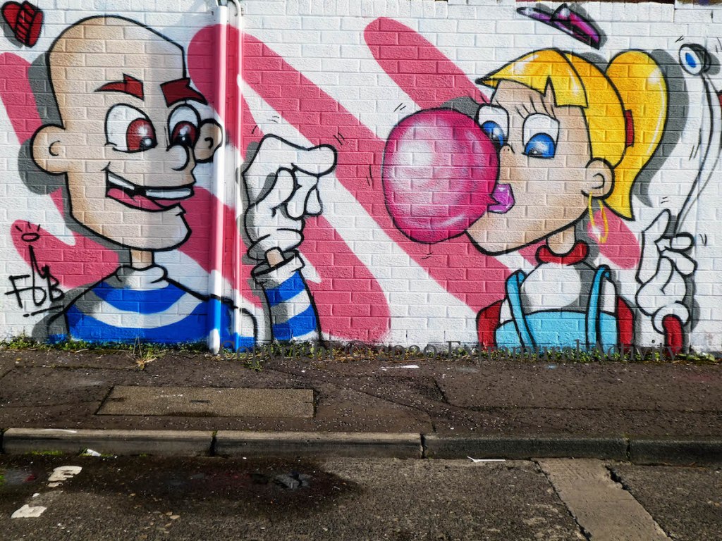 “Who’s in your bubble?” Bubbles are back on everyone’s mind with the introduction on Friday (Oct. 16th) of new restrictions – bubbles are now limited to ten people from two households (NIExecutive) – and a two-week closure of schools. FGB (tw | ig | web) painted this work in Kent Street as part of a socially-distanced HTN 2020.