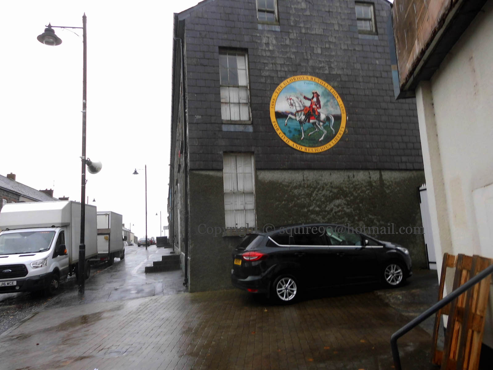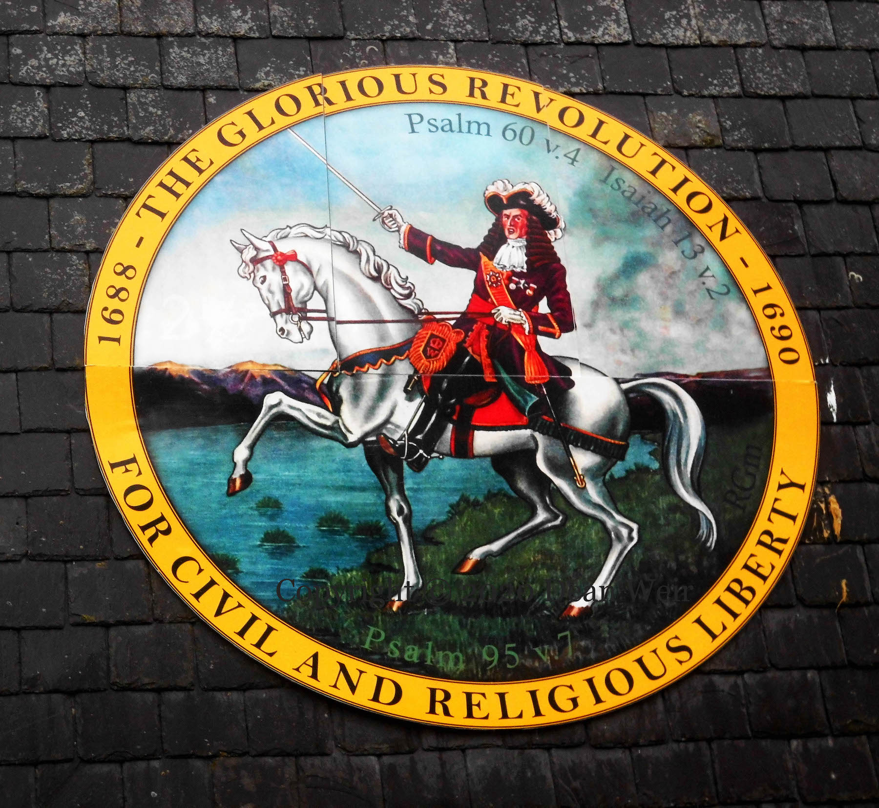“The Glorious Revolution for civil and religious liberty.” King James II of England – a Catholic convert – had a son in 1688 that replaced his (Protestant) daughter Mary as first in line for the English throne. In order to prevent a Catholic succession, William of Orange, Protestant ruler of Holland and Mary’s cousin and husband set sail in October with 40,000 men in 463 ships (WP). He is shown in this new board in Main Street, Markethill leading his troops across the Boyne in Ireland. His success in deposing James would become known as the “Glorious Revolution.”