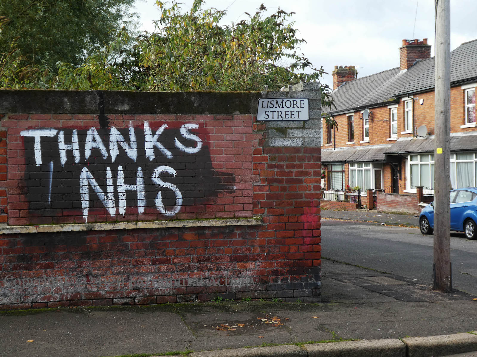 East Belfast’s Lismore Street is recently famous for the removal of bonfire materials in 2019. (See previously: A Vote For The IRA | Dump Wood, No Shite.) The corner of the street usually serves as the “Dump Wood” sign but is currently functioning as a ‘thank you’ to NHS workers.