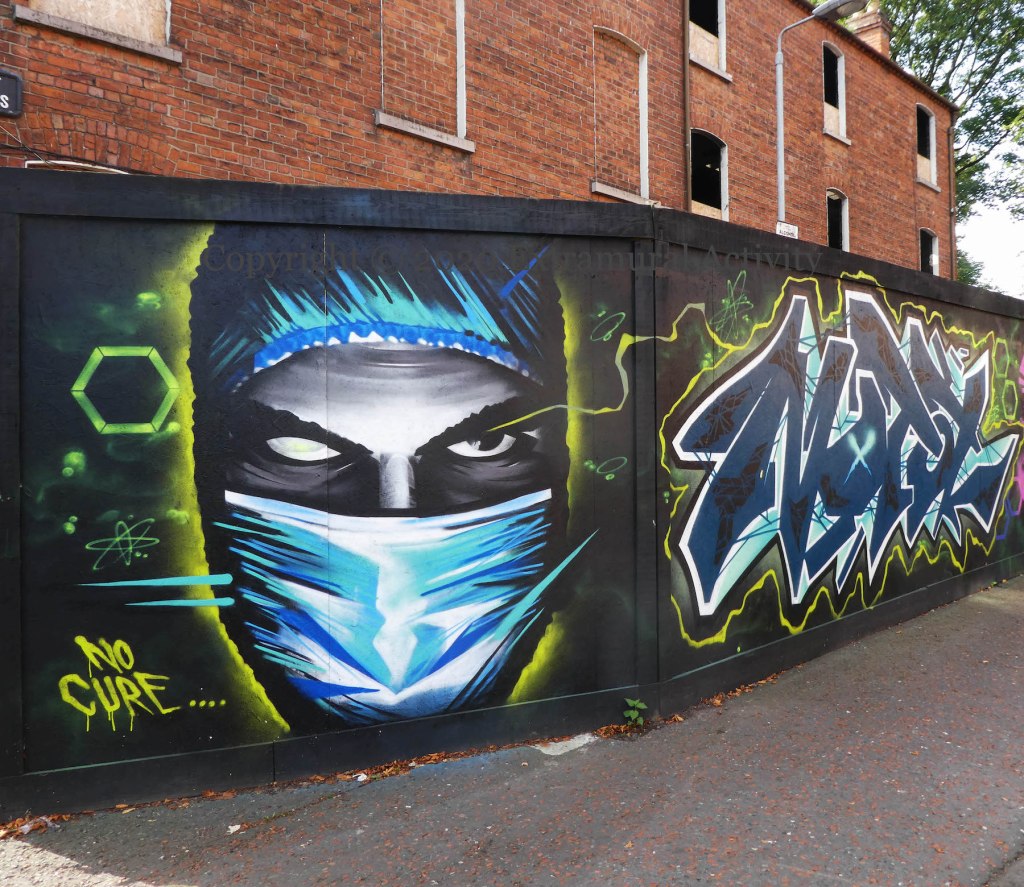 Work by NOTA and the TMN crew (see previously) on the construction hoarding around the old Botanic Lodge (87-91 Botanic Avenue) Belfast. Work started in December (2019) on two commercial units and 14 apartments above (Future Belfast).
