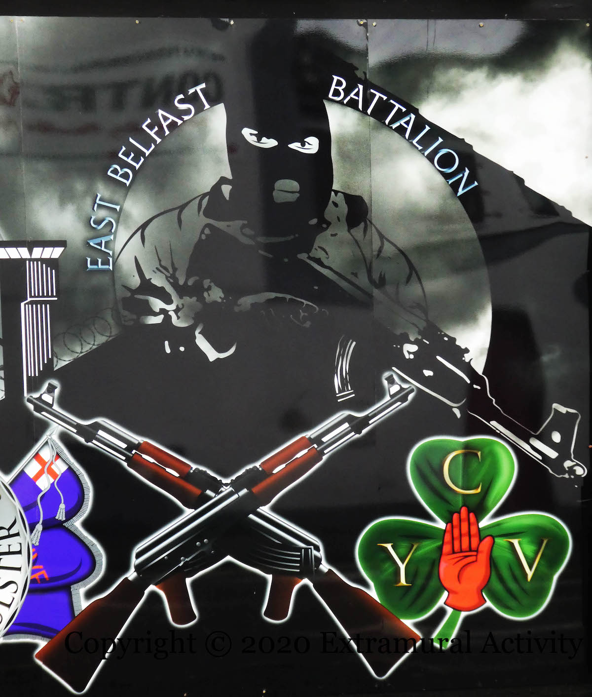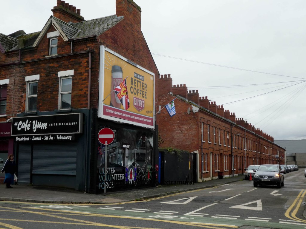 The previous UVF mural in Carrington Street (Volunteering | On Your Side) was paint-bombed in October (Keep It Local) but has been quickly replaced by this computer-generated board showing the Harland & Wolff cranes, a Long Kesh watch-tower, and a hooded gunman from the UVF’s East Belfast Battalion.