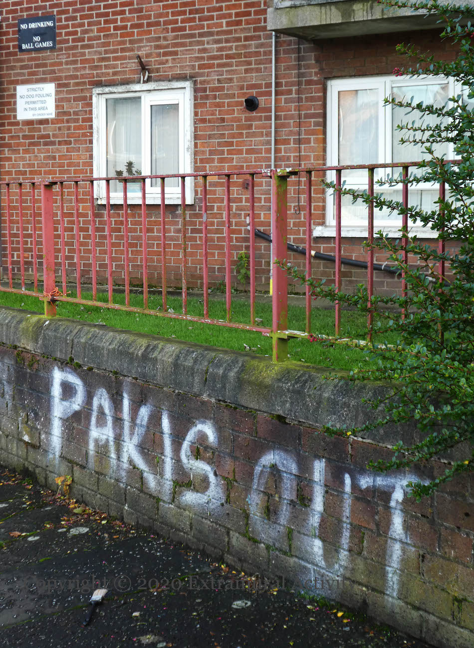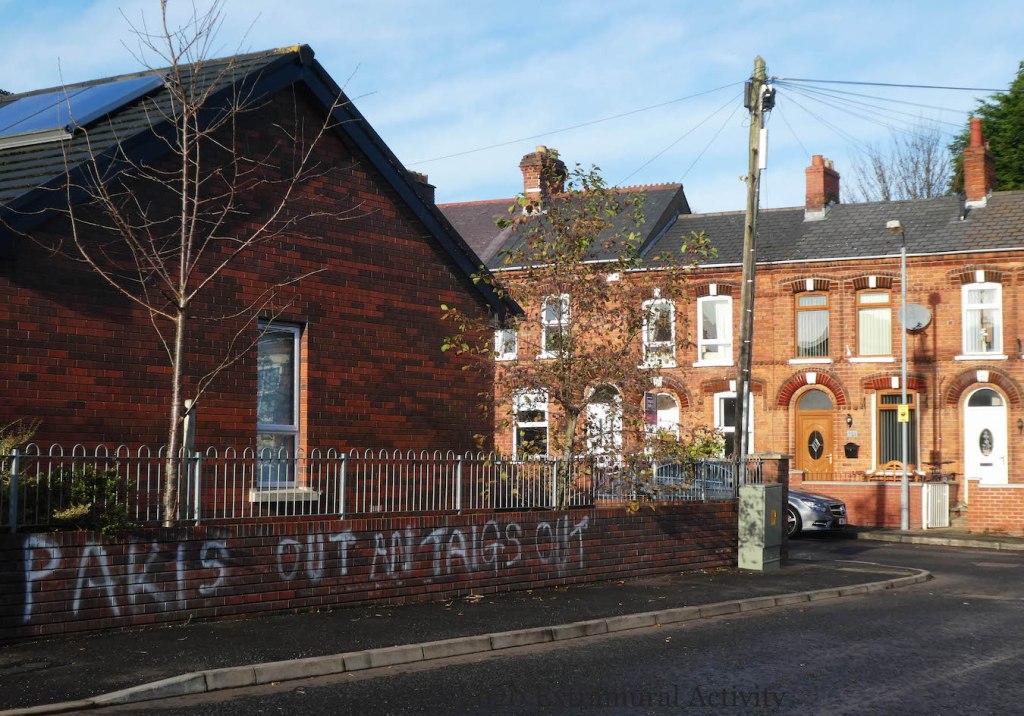 North Belfast is experiencing a housing shortage (Build Homes Now) which means people are willing to go the extra mile for homes, which doesn’t always go down well with the locals. The graffiti shown in today’s post appeared in mid November in the majority-Protestant area of Skegoneill, near the junction with Glandore Avenue and Catholic Ashfield. Police called the graffiti a “hate incident” (QRadio).