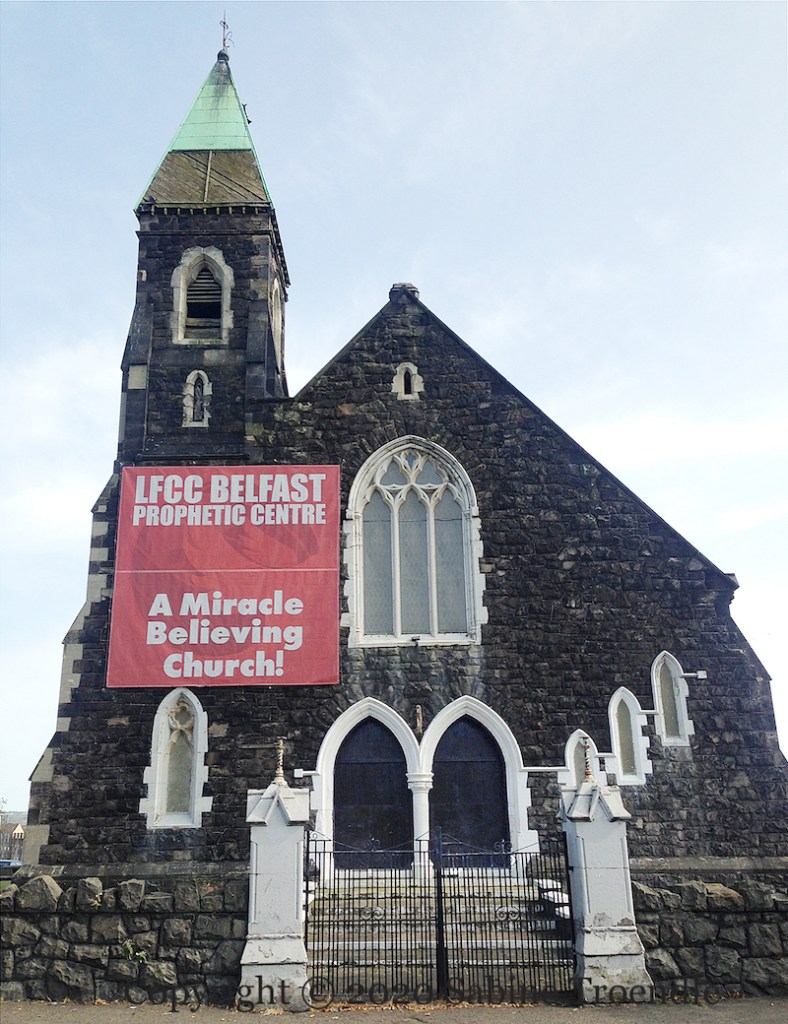 Saint Luke’s C of I opened in 1863 in what was then the lower Falls but – because of the “peace” line is now the lower Shankill. It closed in 2006 and the congregation merged with St Stephen’s (in Millfield). The building served as a community centre. In 2015 two pigs’ heads with racist graffiti were left in the doorway in response to rumours that the building might become a mosque (BBC). The property was (later) acquired by Living Faith Global – “a miracle believing and seeing church” – which opened in April 2019.