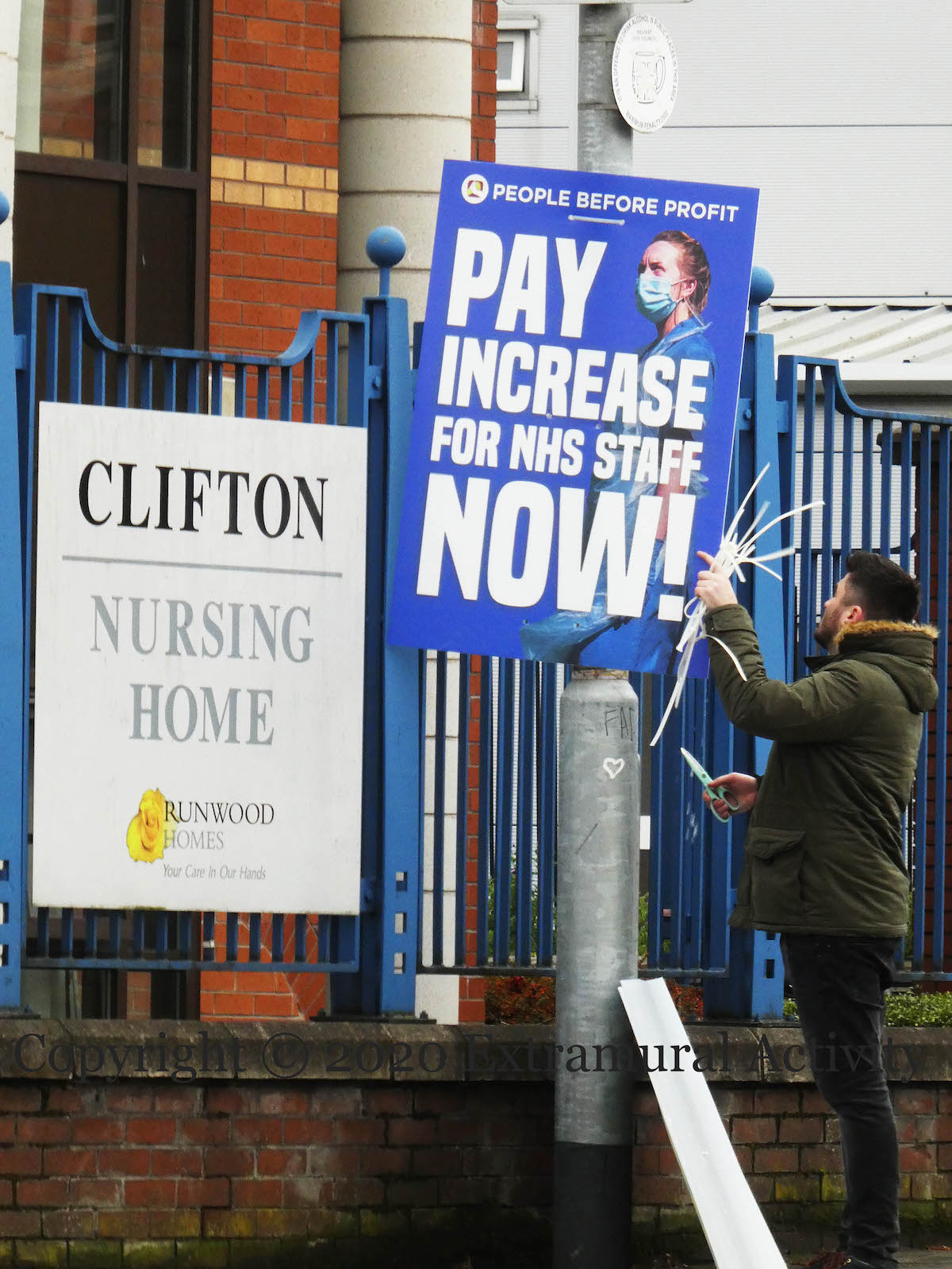 Gratitude for NHS and other front line staff has been in no short supply throughout the pandemic but the cost of the pandemic last month led UK Chancellor Rishi Sunak to moot a pay freeze for public sector workers (BBC). After widespread outcry, including the People Before Profit (web | tw) campaign shown here, he two weeks ago declared that salaries of a million nurses and frontline staff would not be frozen but declined to specify an increase (Nursing Times | iNews).