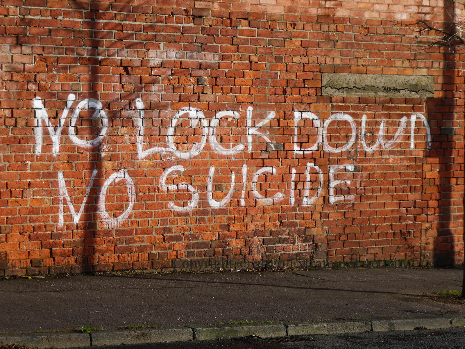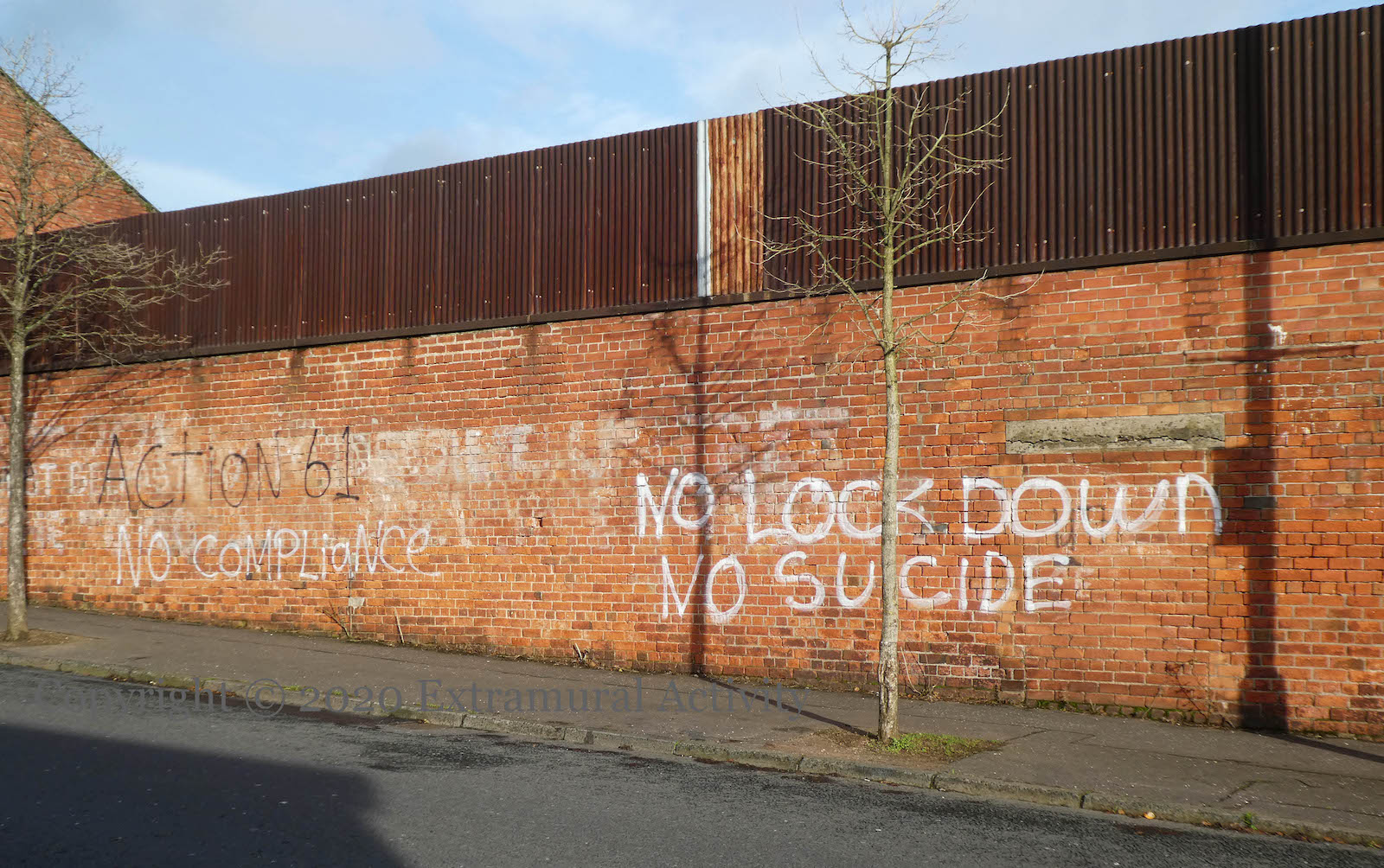 A six-week lockdown beginning on December 26th was approved last night by the executive, which said the current situation required an “urgent intervention” (BBC). The lockdowns are difficult for everyone, not just financially but psychologically. (See previously: Home Is Where The Hurt Is.) This Broadway graffiti suggests that the lockdowns are promoting suicides, though there do not appear to be data yet suggesting an increase in suicide during the pandemic. ‘Action 61’ appears to be a fringe protest group.