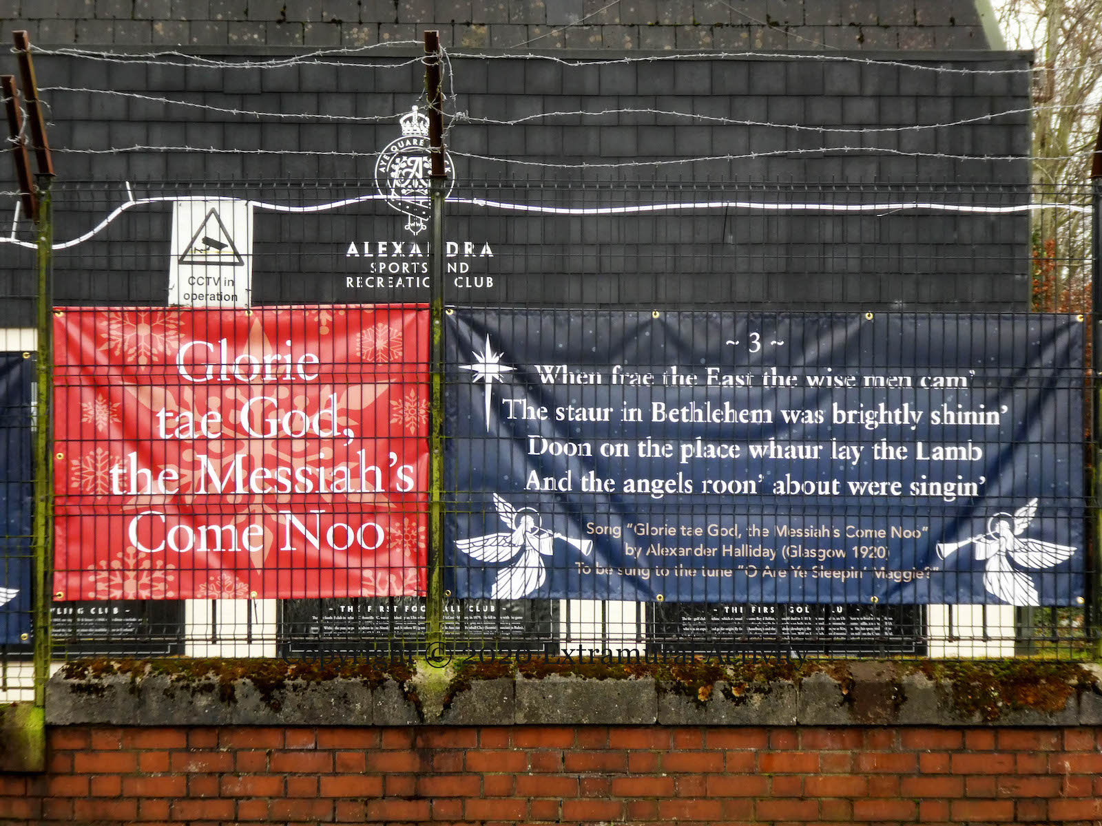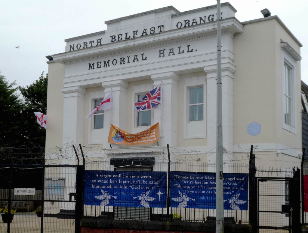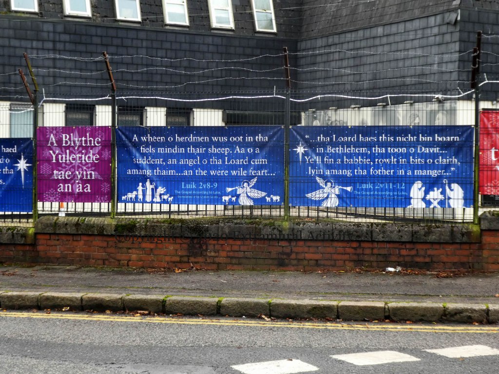 “Glorie tae God, the Messiah’s come noo”. The story of the birth of Jesus is told in Ulstèr-Scotch passages from the Bible and from Alexander Halliday’s song on tarps around the North Belfast Orange Memorial Hall. “A virgin will cairrie a wean … an whan he’s boarn, he’ll be caad Immanuel, mainin “God is wi iz.” (Mattha 1v23)” “When frae the East the wise men cam/The staur in Bethlehem was brightly shinin’/Doon on the place whaur lay the Lamb/And the angels roon’ about were singin’.”
