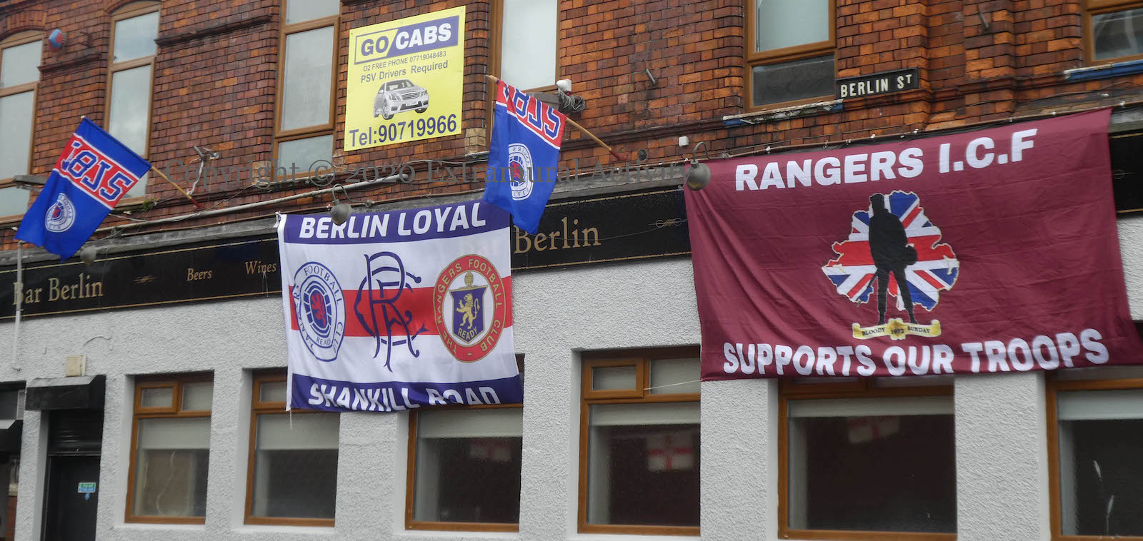 “Rangers ICF [Inter City Firm – football ultras] supports our troops, particularly those who might be accused of crimes on “Bloody Sunday 1972”. The flags are hanging outside Bar Berlin, home of the Berlin Loyal RSC (tw).